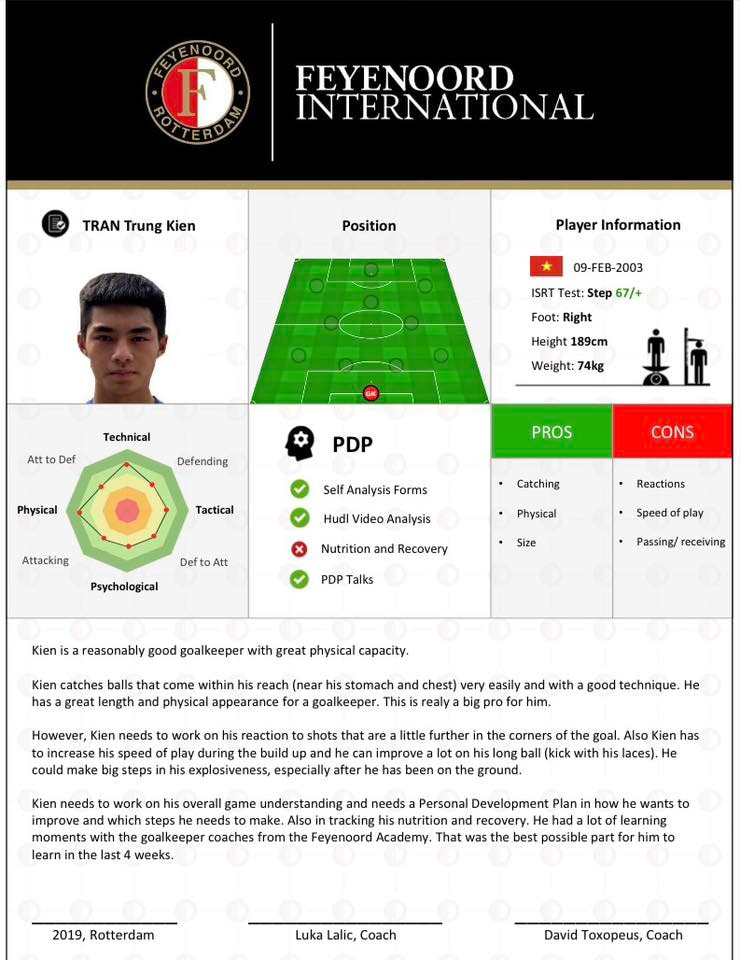 Bản đánh giá năng lực của thủ môn Trung Kiên do các HLV CLB Feyenoord (Hà Lan) ghi nhận và đánh giá