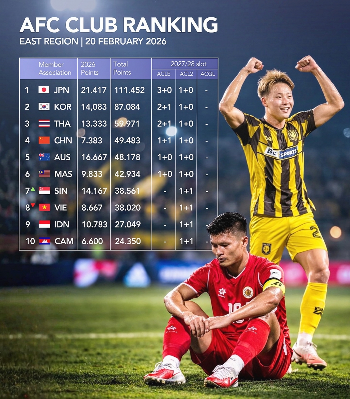 Theo bảng xếp hạng hệ số cấp câu lạc bộ mới nhất do AFC công bố, Việt Nam chính thức rơi xuống vị trí thứ 8 châu Á sau thành tích thi đấu không thành công của CLB CAHN và CLB Nam Định tại Cúp C2 châu Á 2025/2026.