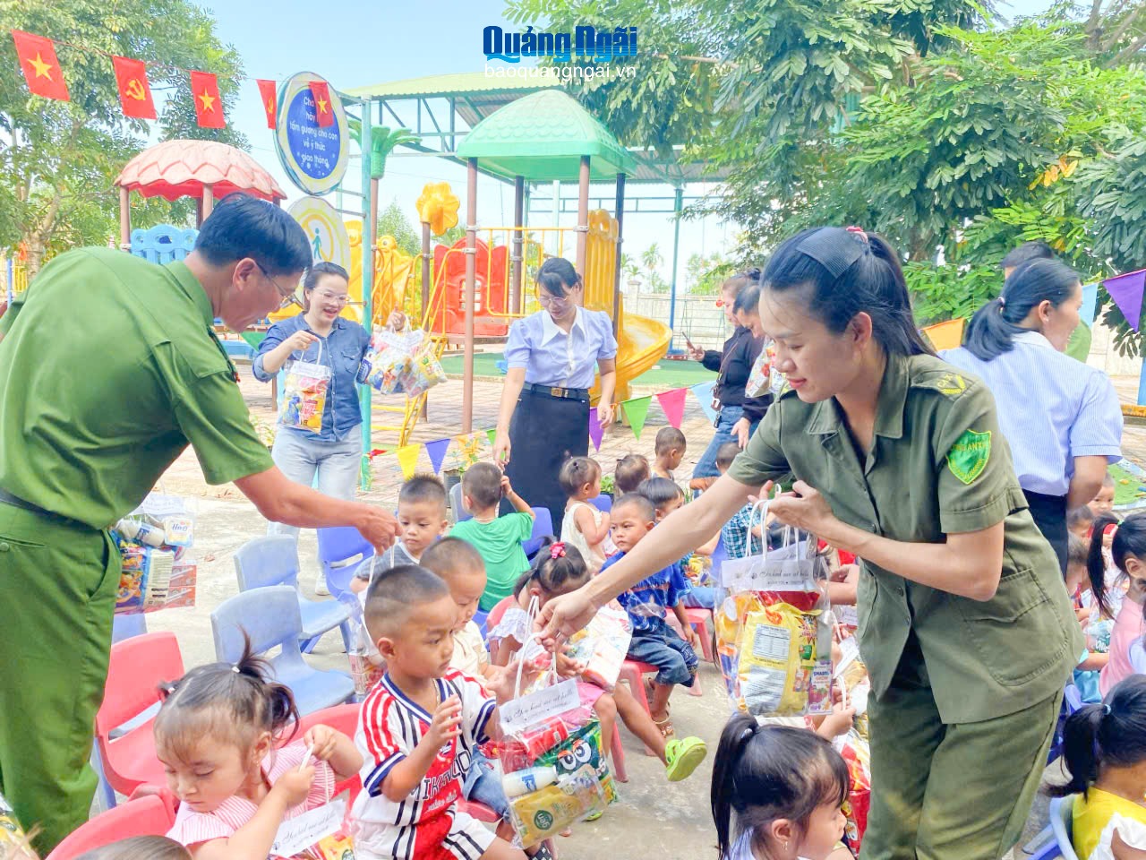 Chị Thảo phối hợp cùng với Công an xã tặng quà Trung thu cho trẻ em tại địa phương.