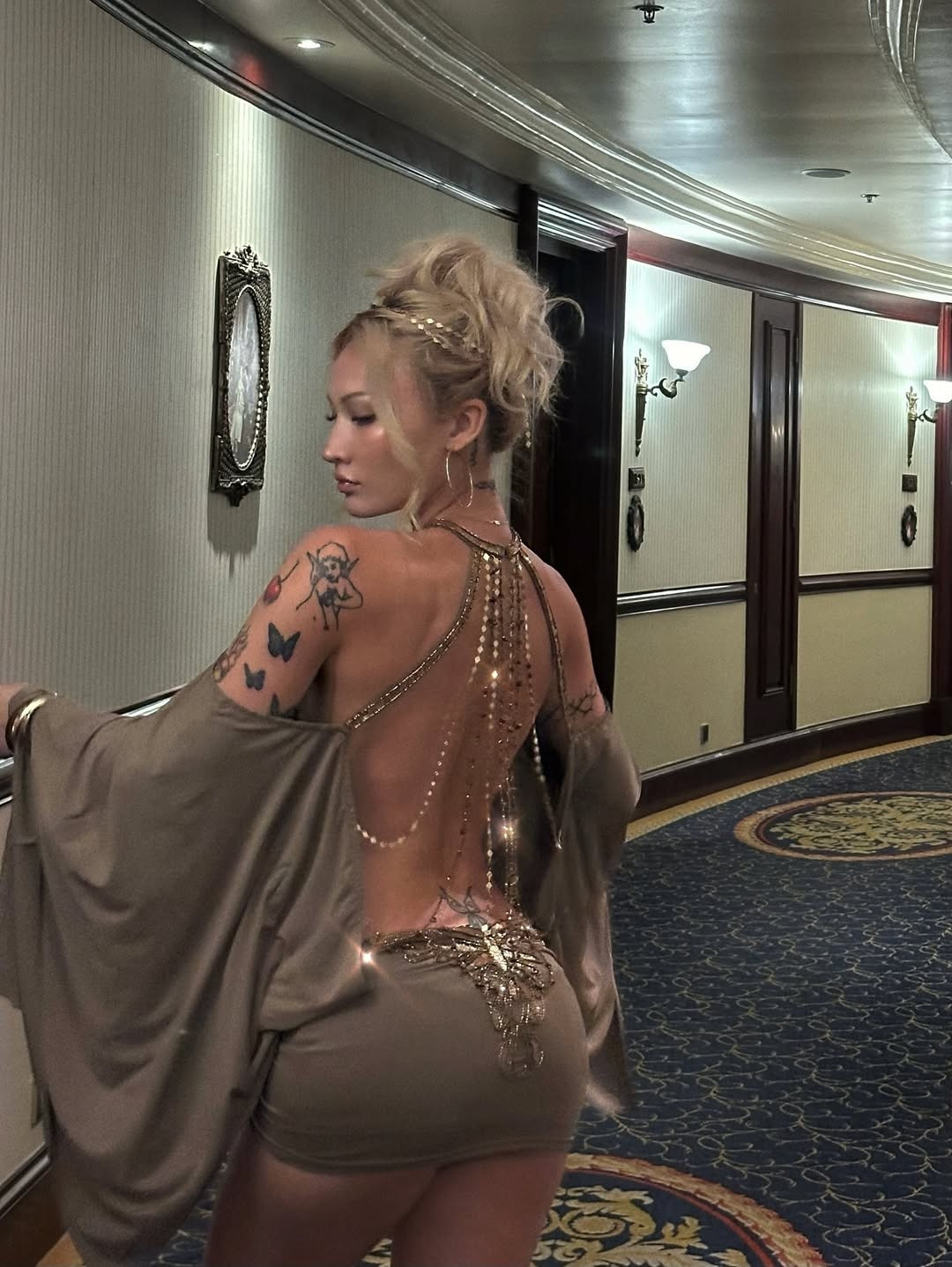 Chiếc váy với phần lưng hở giúp cô nàng khoe những hình xăm nghệ thuật đầy cá tính, tăng thêm vẻ "nghệ" và nổi loạn, hài hòa một cách bất ngờ với trang phục quyến rũ. (Ảnh: IGNV)