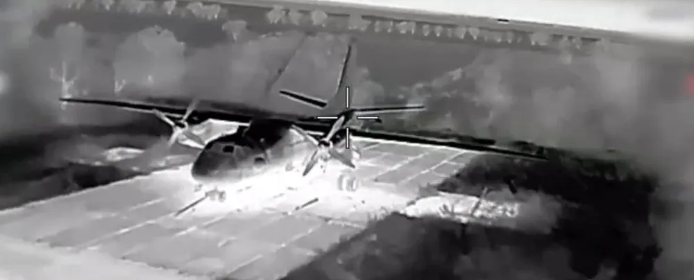 UAV của đặc nhiệm HUR phá hủy 2 vận tải cơ An-26 của Nga trên bán đảo Crimea. Ảnh chụp màn hình: HUR