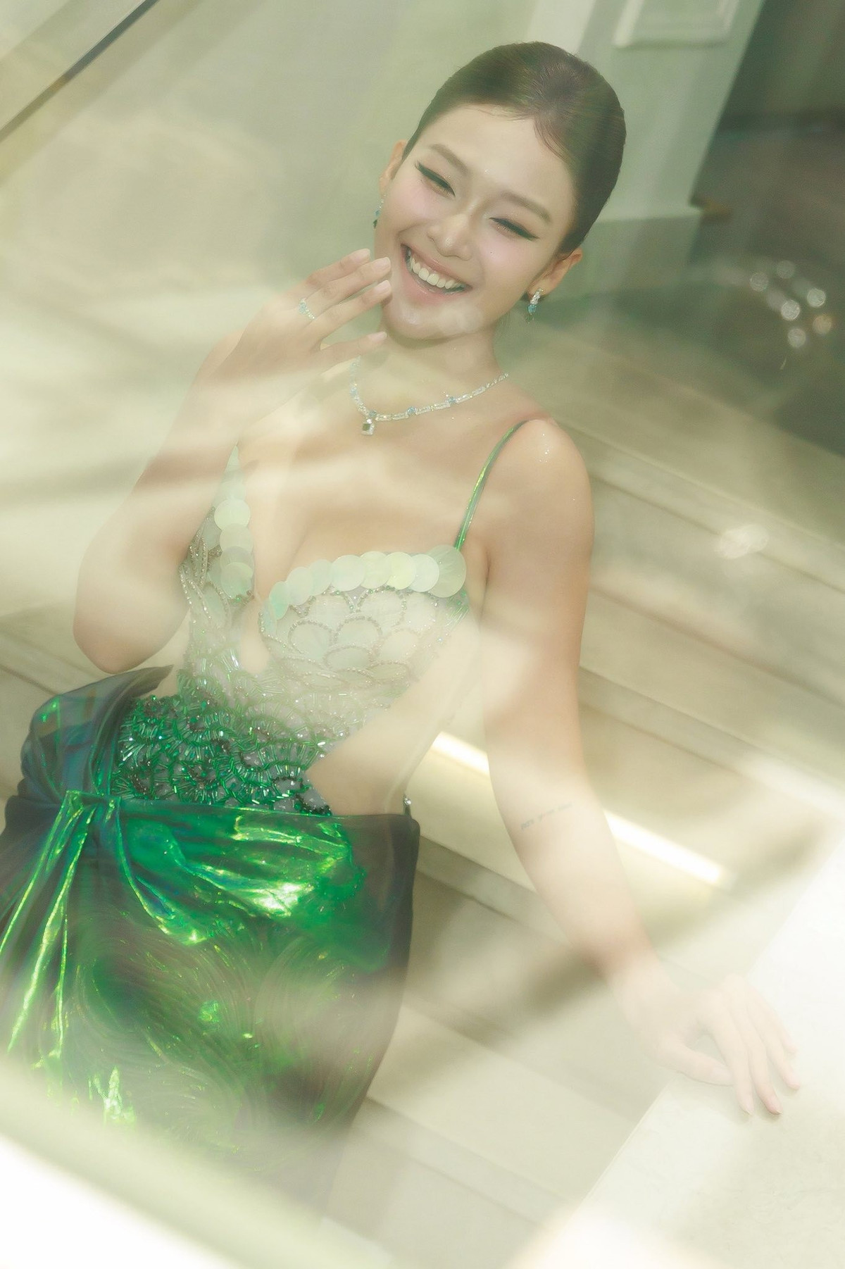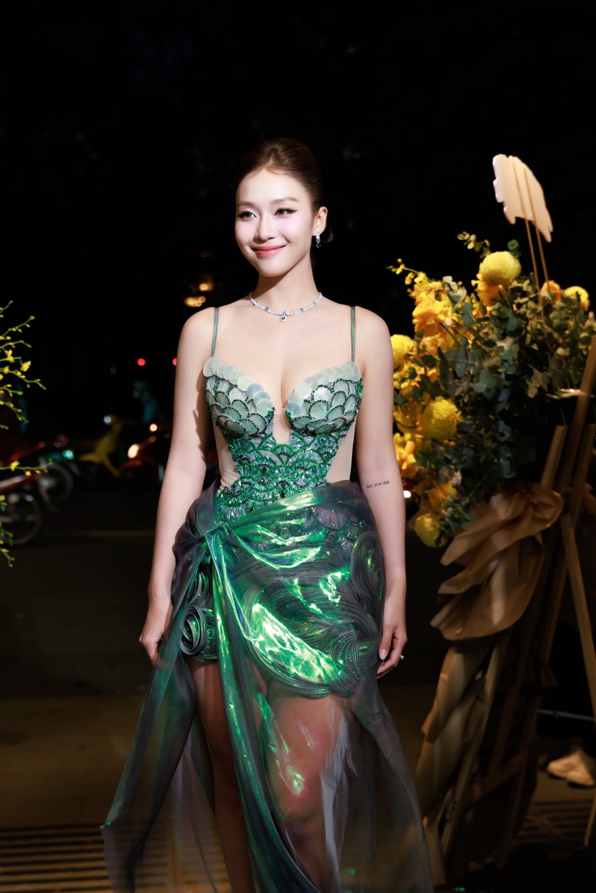 Trong chiếc váy cúp ngực ánh xanh ngọc, Khả Ngân tỏa sáng như "nàng thơ" của điện ảnh Việt.