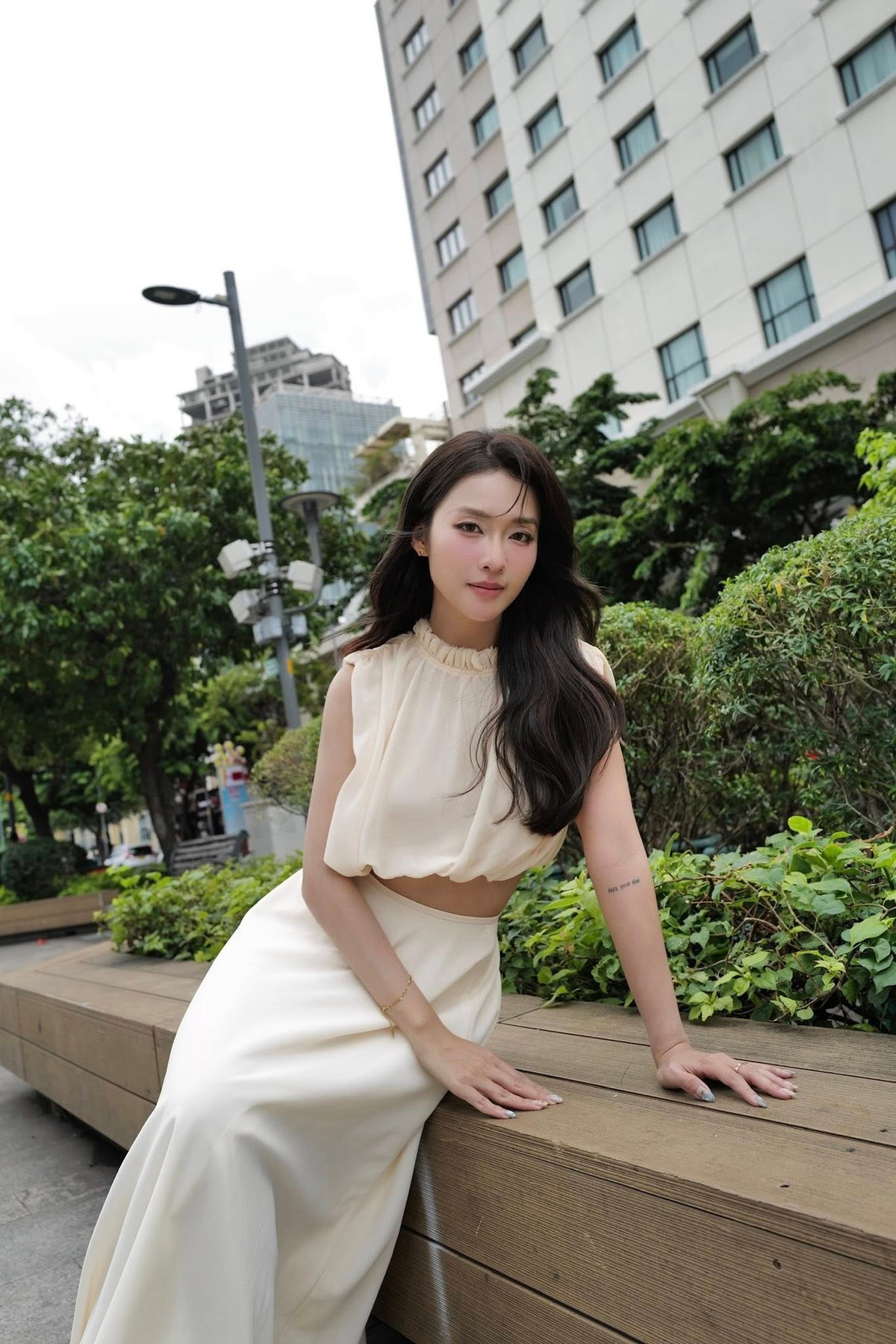Thiết kế tinh tế giúp tôn trọn bờ vai thon, đường cong quyến rũ, trong khi phong cách trang điểm nhẹ nhàng càng làm nổi bật nét đẹp trong trẻo, thanh lịch đặc trưng.
