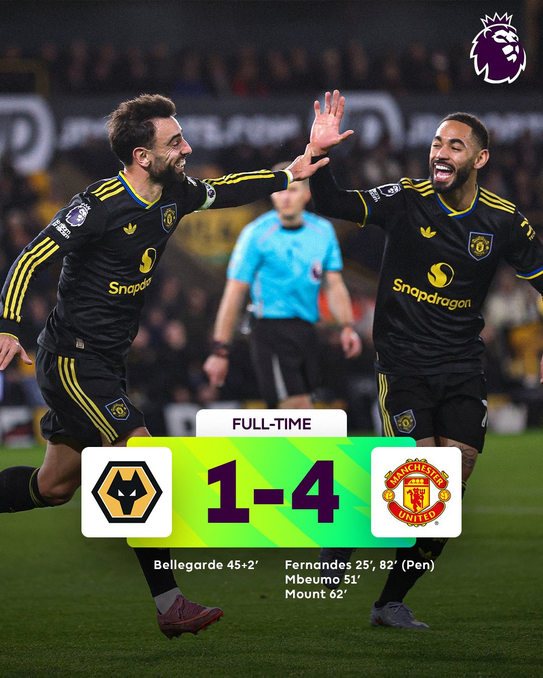 MU càng đá càng hay. Bruno Fernandes ấn định chiến thắng 4-1 trên chấm 11m, sau khi Mosquera để bóng bật tay trong vòng cấm