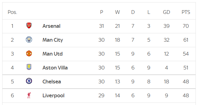 Chung cuộc thắng Aston Villa 3-1, Man Utd chắc chân vị trí thứ 3 trên bảng xếp hạng Ngoại hạng Anh với 54 điểm, kém đội đầu bảng Arsenal 16 điểm. Trong khi đó, Aston Villa xếp thứ 4 khi ít hơn Man Utd 3 điểm.
