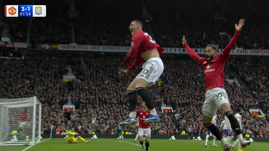 Tới phút 81, cũng là Bruno với tình huống phát động tấn công. Từ quả treo bóng ở giữa sân của Bruno, Cunha khống chế bóng một chạm, vượt qua sự truy cản của hậu vệ Aston Villa xâm nhập vòng cấm trước khi căng ngang hiểm hóc tạo nên tình huống lộn xộn và cầu thủ mới vào sân từ băng ghế dự bị Benjamin Sesko xoay người dứt điểm chân phải tung lưới thủ môn Martinez nâng tỷ số lên 3-1 cho Man Utd.
