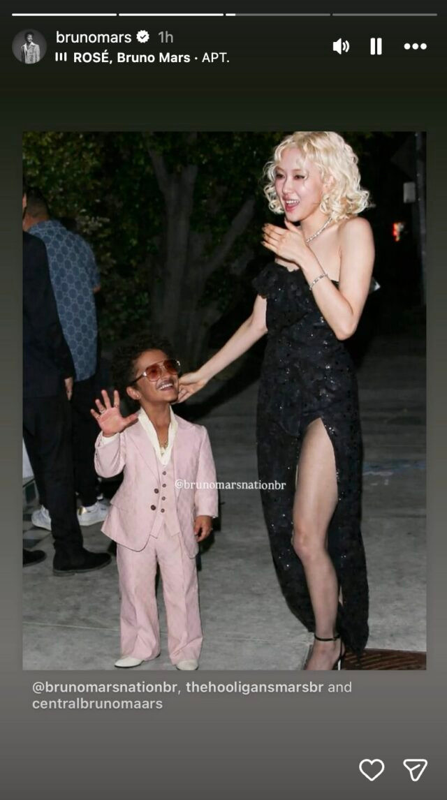 Chưa dừng lại ở đó, Bruno Mars tiếp tục khiến cộng đồng mạng bật cười khi đăng lại một hình ảnh do fan tạo ra, trong đó anh được vẽ thấp hơn Rosé một cách hài hước. Động thái này nhanh chóng thu hút sự chú ý, bởi từ lâu Bruno vốn nổi tiếng với việc tự trào về chiều cao của mình và thường xuyên hưởng ứng những trò đùa mang tính vui vẻ từ người hâm mộ.