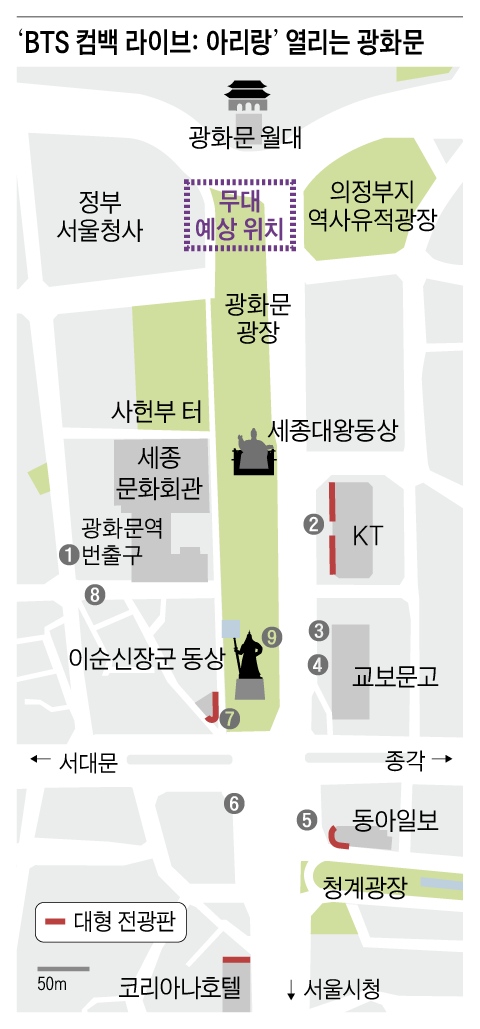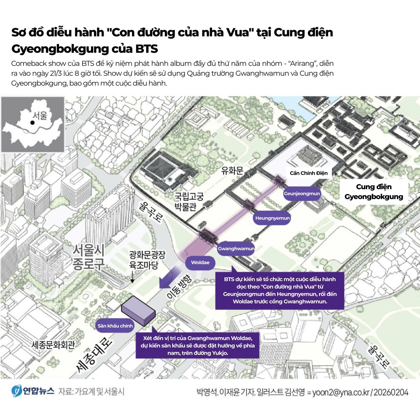 Mới đây, cõi mạng "rúng động" trước thông tin BTS đã được thành phố Seoul và Sở Di sản Văn hóa Hàn Quốc cấp phép tổ chức chương trình "BTS Comeback Live: Arirang" tại Quảng trường Gwanghwamun vào ngày 21/3. Như vậy, nhóm trở thành nghệ sĩ đầu tiên trong lịch sử tổ chức concert tại biểu tượng của lịch sử Seoul.