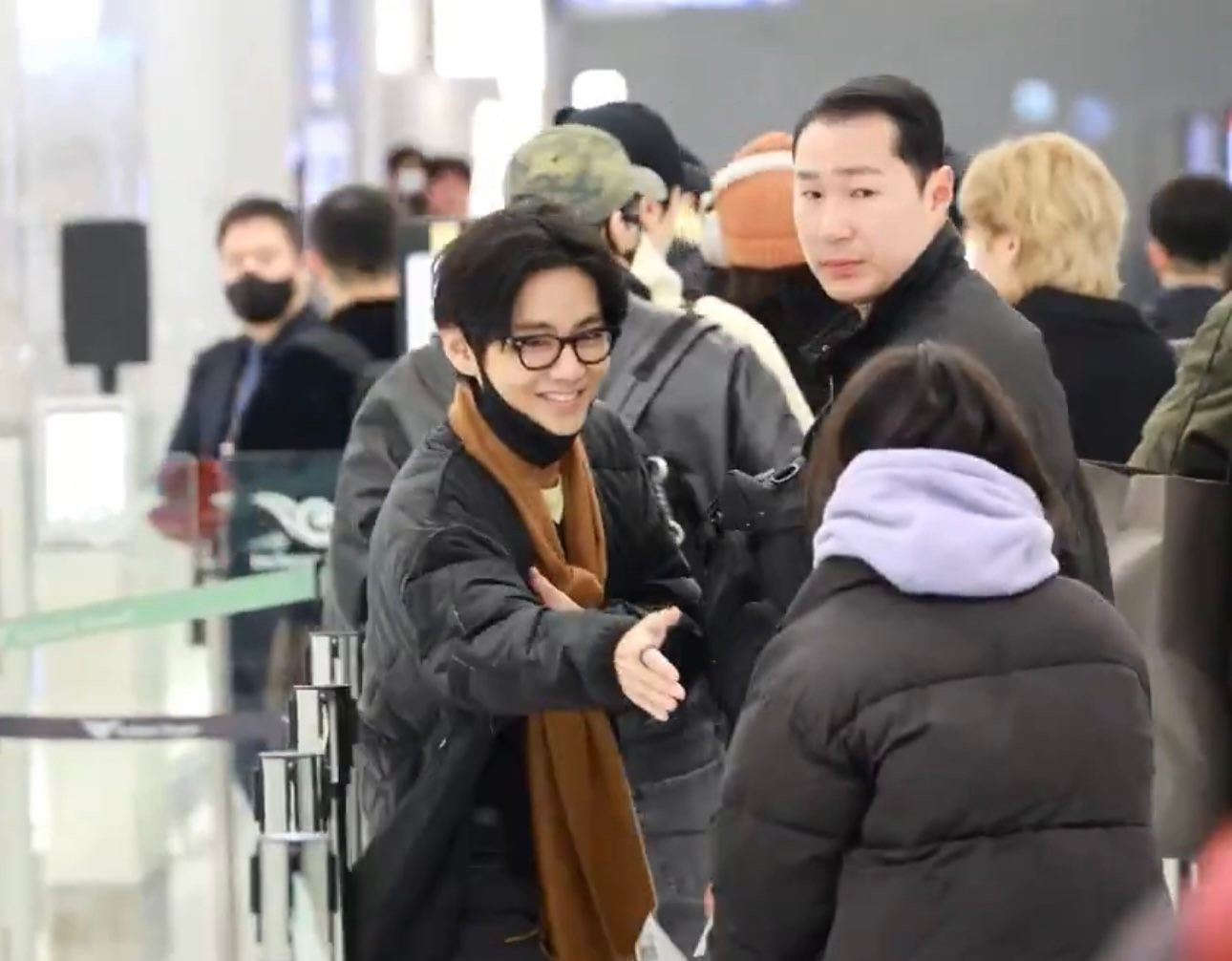 Tối 2/2 tại sân bay Incheon, cả 7 thành viên BTS lần đầu tiên lộ diện cùng nhau trước truyền thông để chuẩn bị cho lịch trình ở Dubai. Các thành viên không giấu được niềm phấn khích khi gặp người hâm mộ sau khoảng thời gian dài. Một ARMY chờ làm thủ tục đã vẫy tay chào BTS, nên V cũng chủ động tiến đến bắt tay và mỉm cười với cô. Trong khi đó, Jung Kook thích thú ghi lại khoảnh khắc BTS xuất hiện tại sân bay Incheon trong vòng tay của các ARMY.