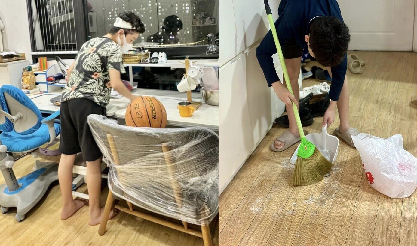 Khải Minh và Khải Nguyên luôn tự giác, biết phụ giúp mẹ làm việc nhà.