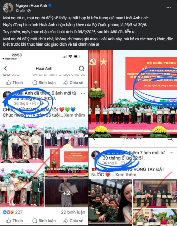 BTV nói thêm: "Với mong muốn ngăn chặn một số người lầm tưởng sẽ chịu thiệt hại khi đặt lòng tin ở trang giả mạo này, Hoài Anh đăng bài viết này chính thức cảnh báo với mọi người trang Facebook này không phải của Hoài Anh. Mọi người đừng chuyển gì vào các tài khoản trên trang đó".