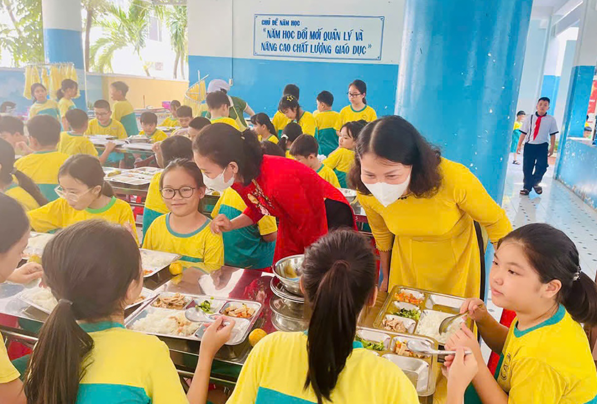 Đoàn công tác UBND phường Tam Thắng (TPHCM) giám sát bữa ăn bán trú tại Trường Tiểu học Lê Lợi. Ảnh: KHÁNH CHI
