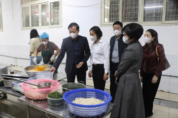 Đoàn kiểm tra thực tế bếp ăn tại Trường Tiểu học Cự Khê (xã Bình Minh, TP Hà Nội)