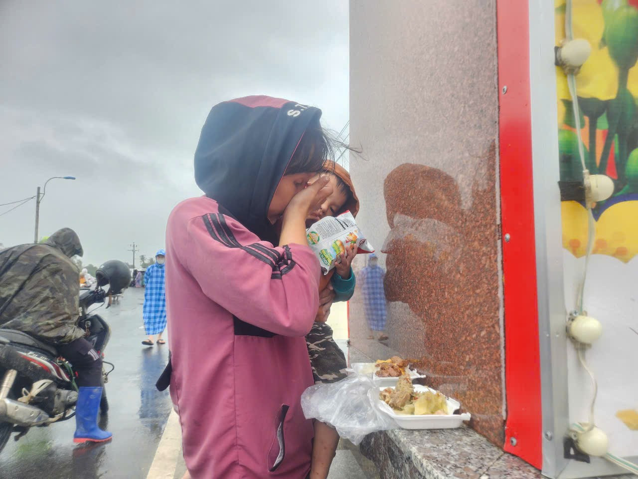 Cơn mưa nặng hạt không ngừng rơi, đường liên xã chật kín xe tải, ô tô cứu trợ hai chiều, lực lượng chức năng tất bật điều tiết giao thông. Ngay cổng chào Hòa Thịnh, hình ảnh người phụ nữ đầu trần, khuôn mặt phờ phạc, bế đứa con nhỏ đứng chờ nhận bát cơm từ thiện khiến ai nấy nghẹn ngào. Đó là chị Phan Thị Tiểu Nhi (33 tuổi, trú thôn Phú Hữu), mồ côi bố mẹ từ hơn 10 năm nay, sống cùng chồng và con nhỏ.
