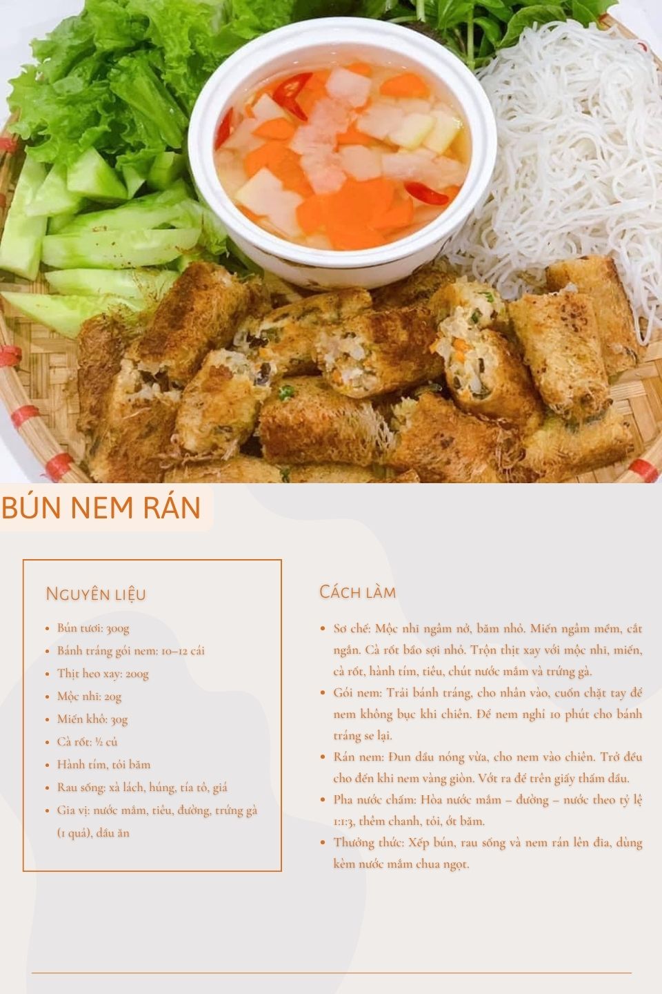 Bún nem rán là lựa chọn lý tưởng cho bữa trưa nhanh gọn mà vẫn đủ năng lượng. Món ăn không chỉ có sẵn ở các quán ăn mà còn dễ dàng thực hiện tại nhà. Chỉ cần một đĩa nem rán nóng hổi, bún tươi và chén nước mắm nhỏ, mọi người đã có ngay phần ăn no bụng, thơm ngon và quen thuộc.