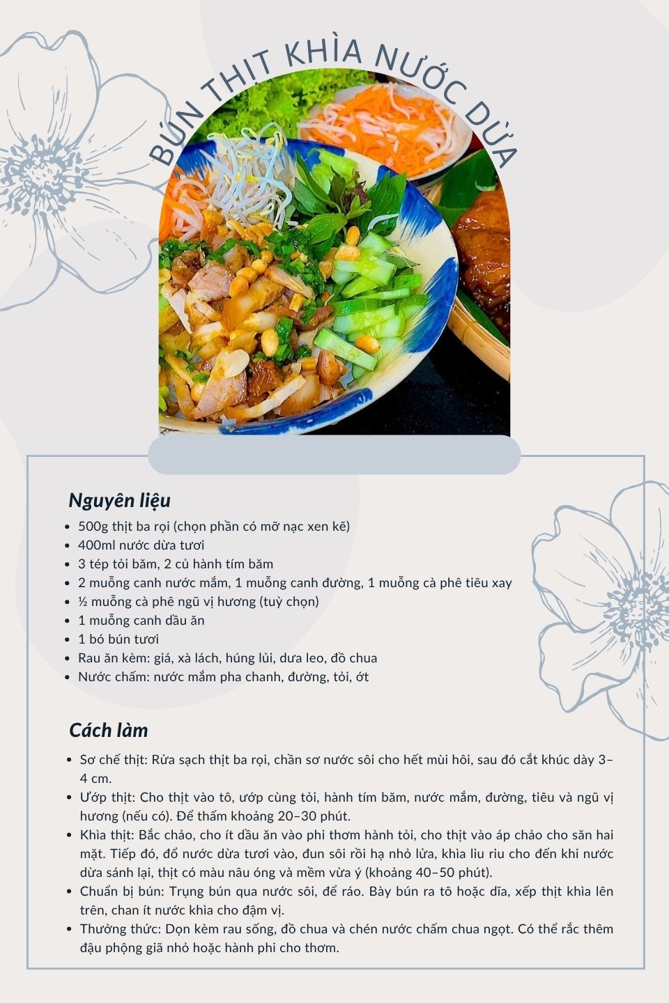 Với nguyên liệu gần gũi, cách làm đơn giản nhưng tỉ mỉ, bún thịt khìa nước dừa không chỉ là món ăn ngon mà còn gợi nhắc hương vị quê nhà. Đây là món ăn lý tưởng cho bữa trưa giữa tuần, vừa đầy đủ năng lượng, vừa thanh vị và dễ ăn.