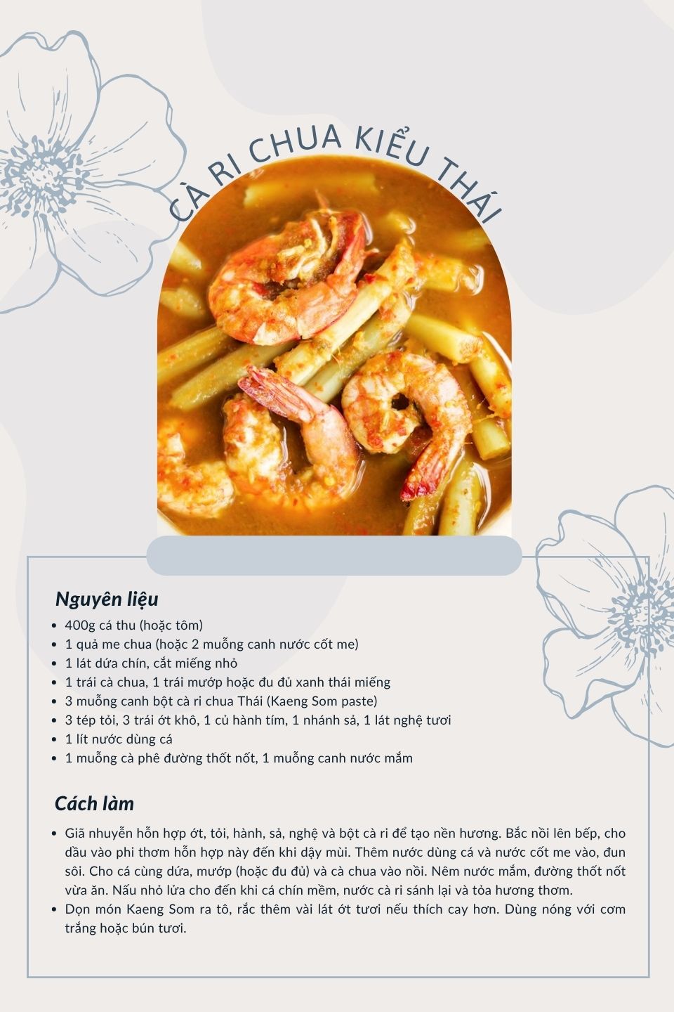 Khác với nhiều món cà ri nổi tiếng như cà ri xanh hay cà ri đỏ, Kaeng Som lại có phần dân dã hơn, bắt nguồn từ các vùng miền Nam và miền Trung Thái Lan. Món ăn này thường nấu với cá tươi, tôm hoặc các loại hải sản, kết hợp cùng rau củ như đu đủ, mướp, bắp cải hay hoa chuối, tạo nên sự hòa quyện giữa vị chua dịu và cay nồng.