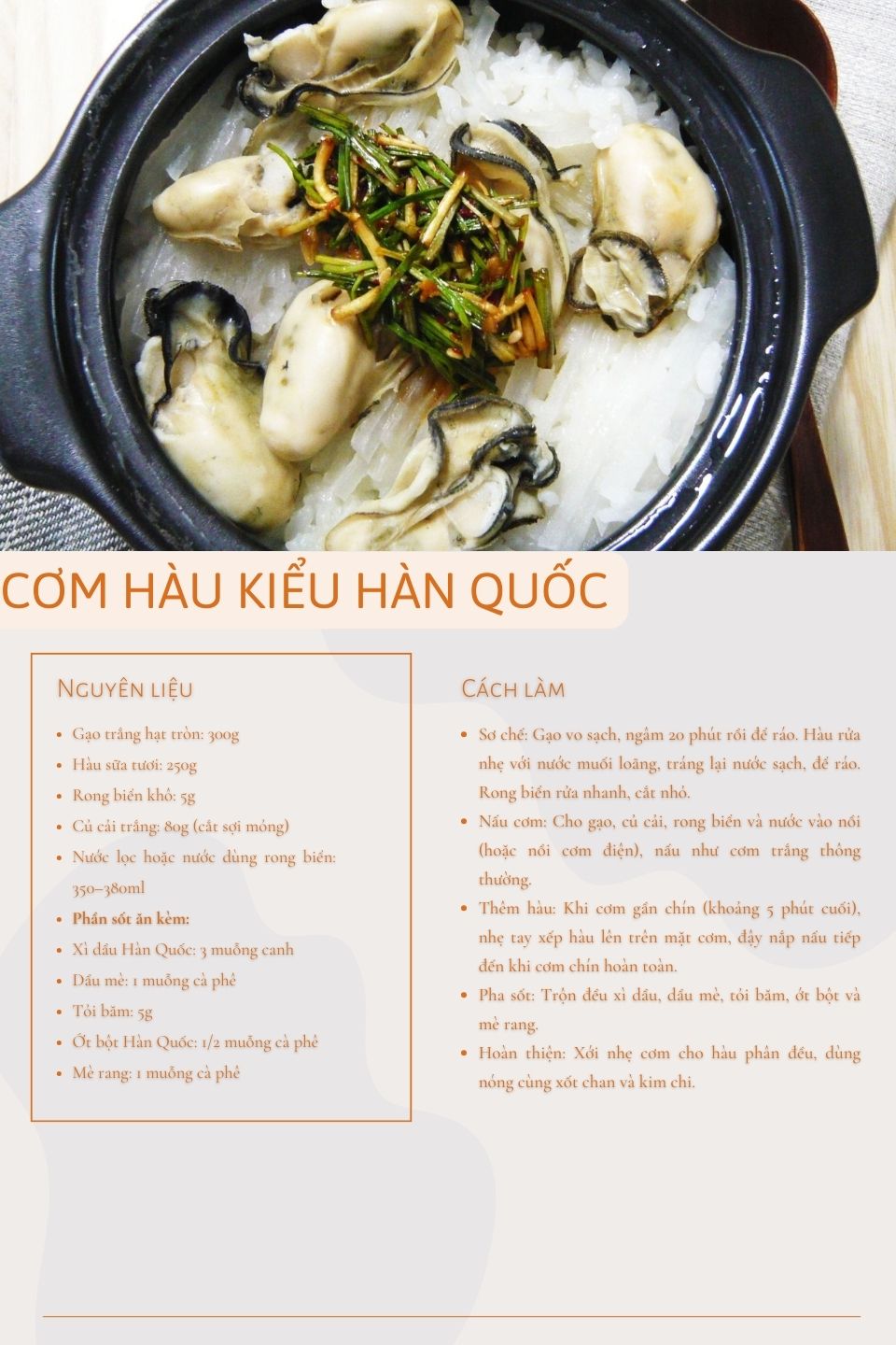 Không giống nhiều món cơm trộn khác của Hàn Quốc vốn nhiều màu sắc và gia vị, Gul-Bap giữ lối nấu giản dị. Cơm sau khi chín xới nhẹ để hàu phân bố đều, bốc lên mùi thơm rất đặc trưng, vừa là mùi gạo nóng, vừa phảng phất vị biển. Món ăn thường dùng kèm nước sốt chan riêng làm từ xì dầu, dầu mè, tỏi và ớt, giúp người ăn tự điều chỉnh độ đậm nhạt theo khẩu vị.