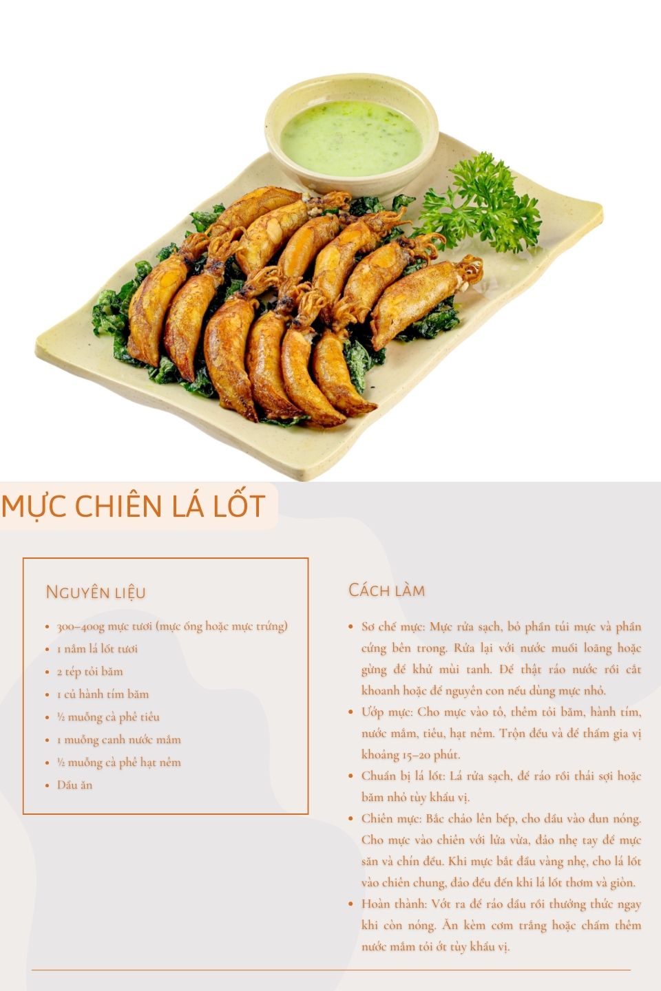 Mực chiên lá lốt ngon nhất là khi vừa bưng ra khỏi bếp, nóng hổi. Món này ăn kèm cơm trắng rất đưa cơm, hoặc dùng làm món lai rai đều hợp. Nhờ sự kết hợp giữa vị biển và hương lá quê nhà, mực chiên lá lốt mang lại cảm giác vừa quen thuộc, vừa thú vị, khiến ai ăn một lần cũng nhớ mãi.