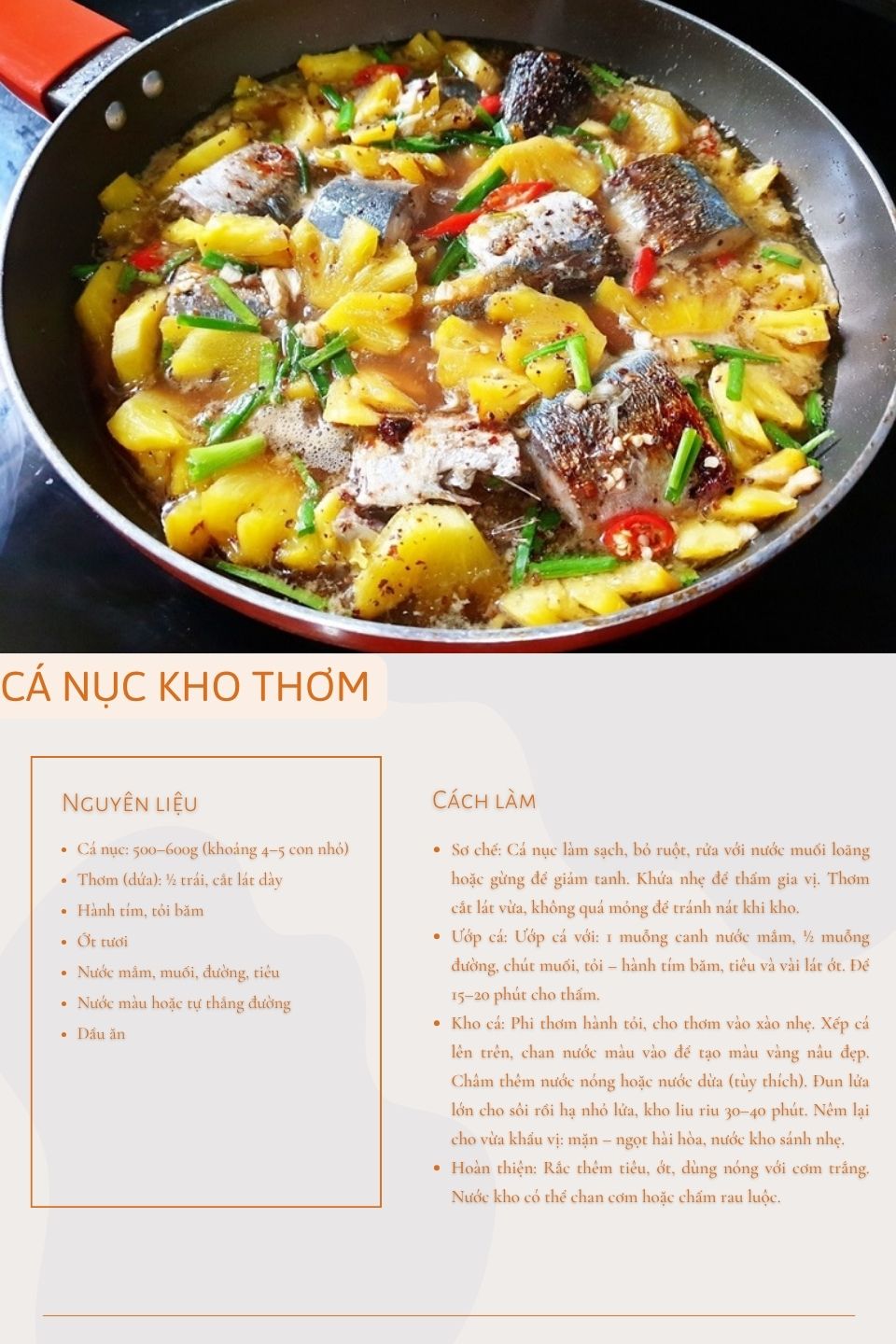 Cá nục là loại cá có quanh năm, giá phải chăng, dễ chọn mua. Cá ngon thường có mắt trong, thân sáng, thịt chắc. Cách sơ chế cũng đơn giản, chỉ cần làm sạch bụng, rửa với nước muối loãng hoặc gừng để khử tanh. Phần thơm chọn quả vừa chín tới để khi kho không bị nát nhưng vẫn đủ ngọt. Khi cắt, nên để lát dày vừa phải để thơm giữ hình và giúp phần nước kho dậy mùi.