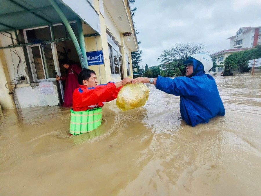 Nước ngập sâu nhưng các giáo viên vẫn đến ký túc xá hỗ trợ sinh viên. Ảnh: Báo Gia Lai.