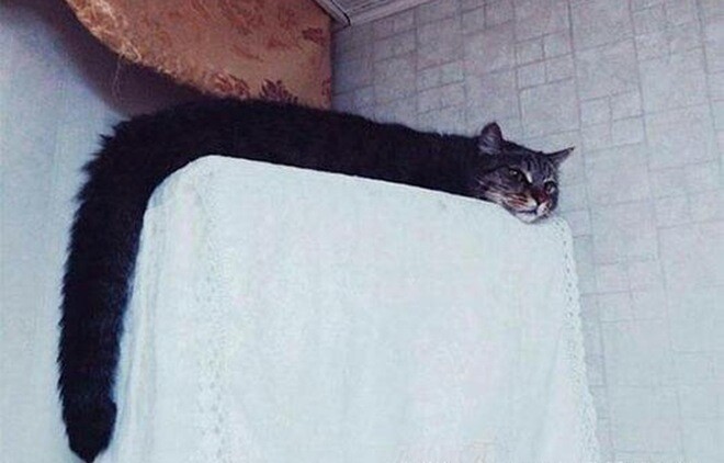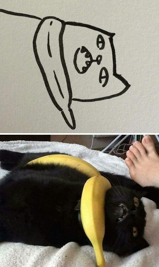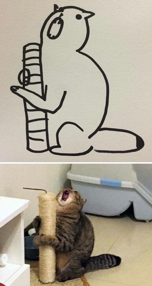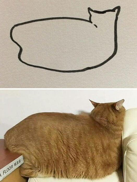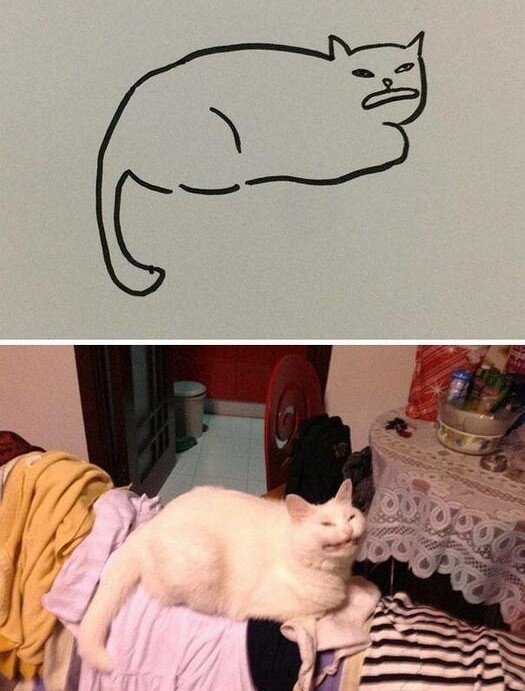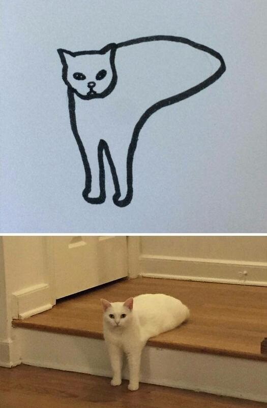 Tuy nhiên, khi người mẹ lấy điện thoại ra và cho xem hình ảnh con mèo thật ở nhà, cô giáo không khỏi ngạc nhiên. Trong bức ảnh, con mèo nằm dài trên tủ, chân tay giấu kín, đuôi vắt ngang – tư thế gần như trùng khớp với bức tranh của cậu bé.