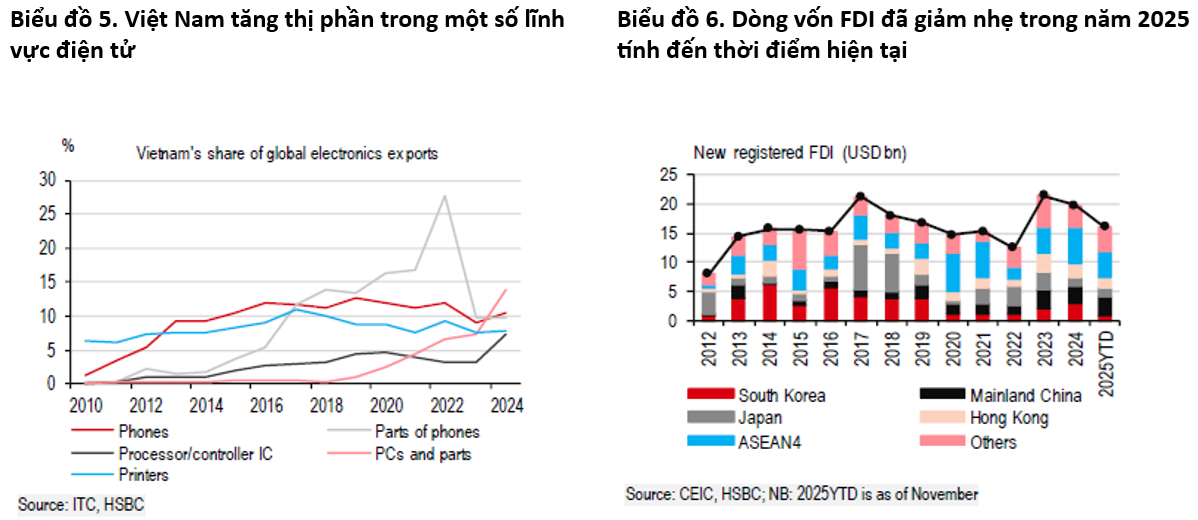 Tuy nhiên, xu hướng đã thay đổi khá nhanh và xuất khẩu điện tử đã ghi nhận mức tăng trưởng theo cấp số nhân. Xét theo tháng, tỷ trọng hàng điện tử từ mức từng chỉ bằng khoảng 1/7 so với nhóm hàng công nghiệp sản xuất nhẹ vào năm 2013, đã tăng lên gần tương đương vào năm 2024. Từ đầu năm 2025, nhóm hàng điện tử đã vượt nhóm hàng công nghiệp sản xuất nhẹ để trở thành mặt hàng xuất khẩu hàng đầu sang thị trường Mỹ.