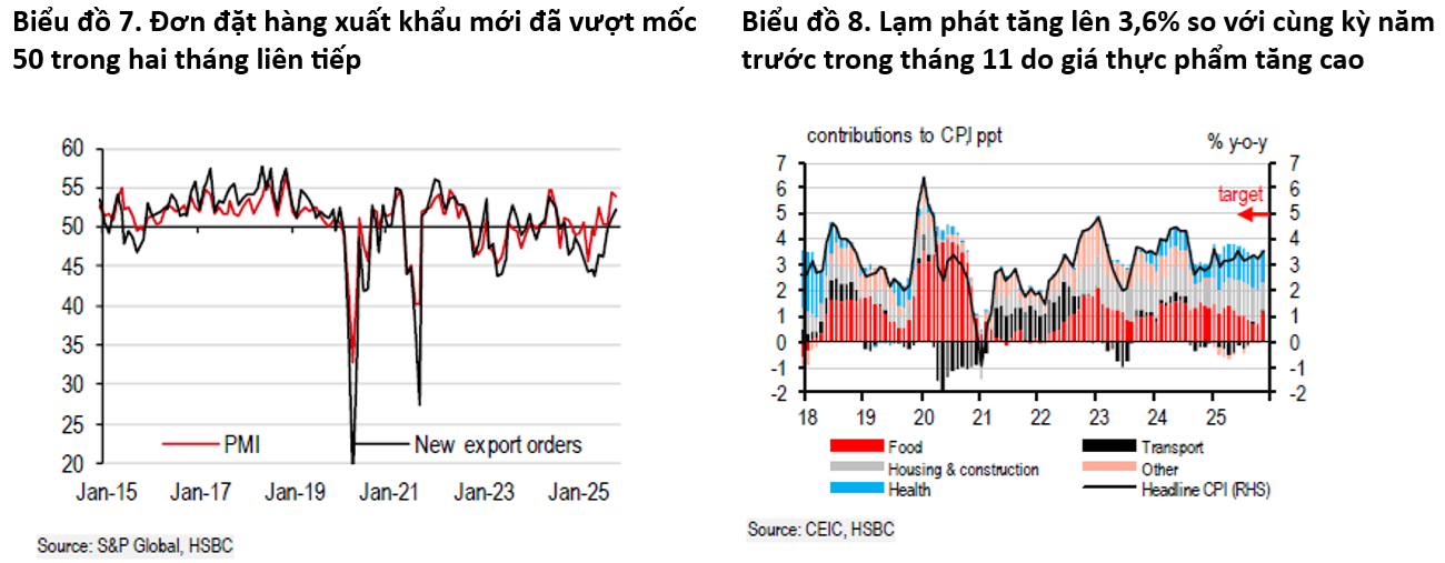 Mặc dù khó có thể dự đoán diễn biến của năm 2026 nhưng các chỉ số chính như PMI mang lại một số tín hiệu khả quan. Chỉ số PMI chính vẫn ở mức mở rộng 53,8 trong tháng 11, trong đó, một số chỉ số phụ cũng vượt qua mốc 50.