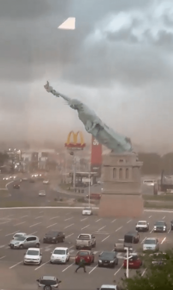 Bức tượng cao khoảng 21,7 mét bị nghiêng trước khi đổ sập xuống bãi đậu xe ở Gúaiba, Brazil. Gió mạnh đạt tốc độ lên tới 55 dặm/giờ khi Brazil bị ảnh hưởng bởi một cơn bão mạnh vào ngày 15/12.
