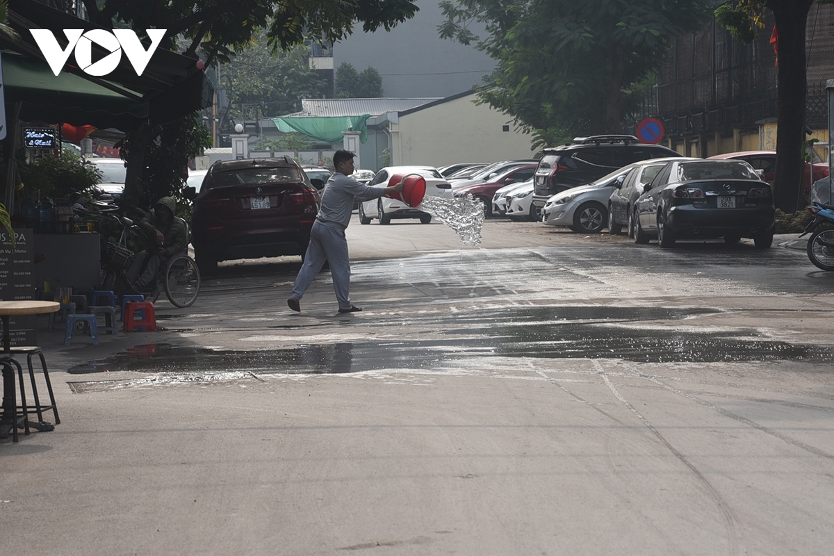 Người dân sống ven đường liên tục tạt nước ra đường để giảm bụi bám.