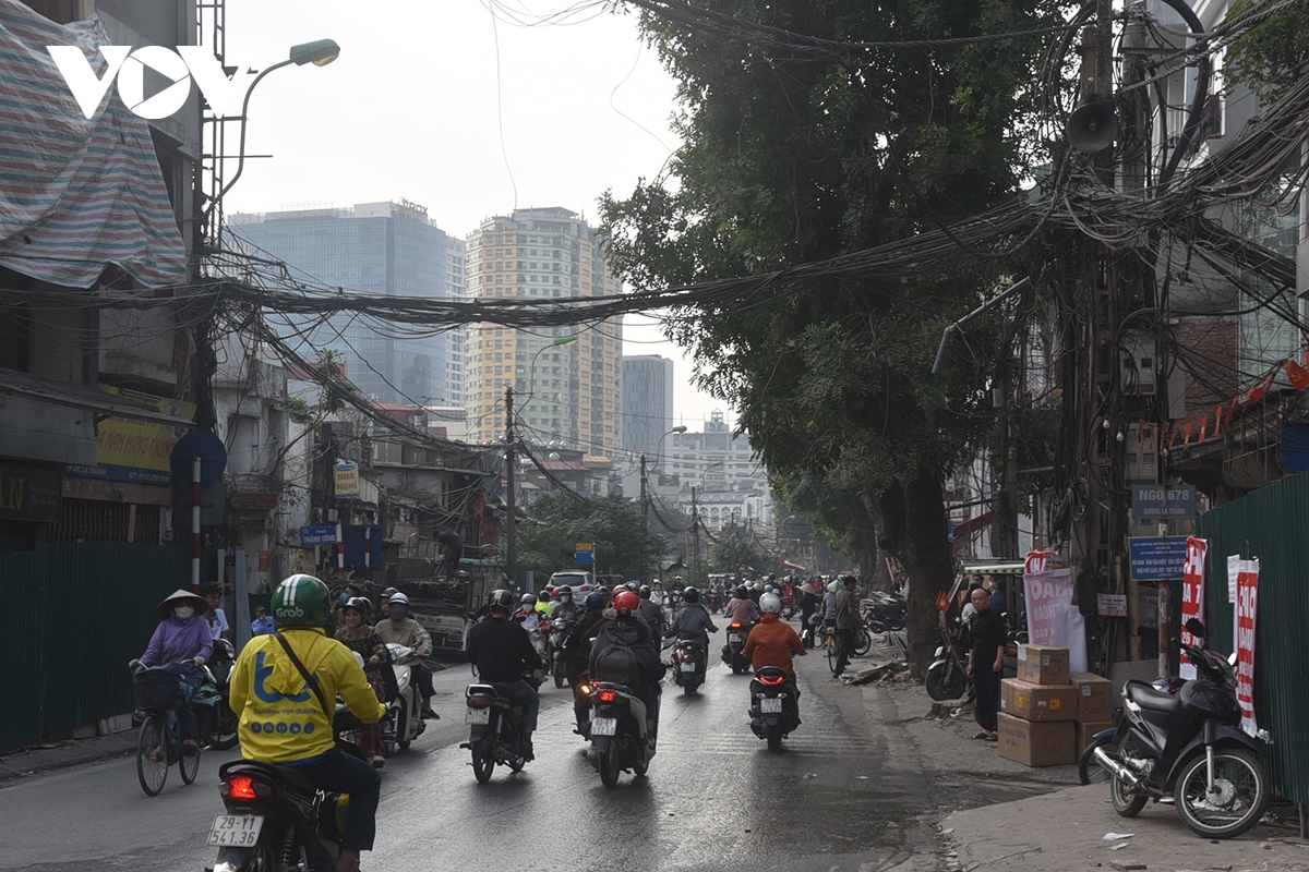 Nhiều phương tiện di chuyển chậm, bật đèn xe vì bụi che khuất tầm nhìn tại đoạn Đầm Hồng – Giải Phóng. Bụi từ công trình không chỉ ảnh hưởng trực tiếp đến giao thông và sinh hoạt mà còn tác động tiêu cực đến sức khỏe cộng đồng, nhất là khi nồng độ bụi mịn PM2.5 tại Hà Nội thời điểm này đang vượt ngưỡng khuyến cáo.