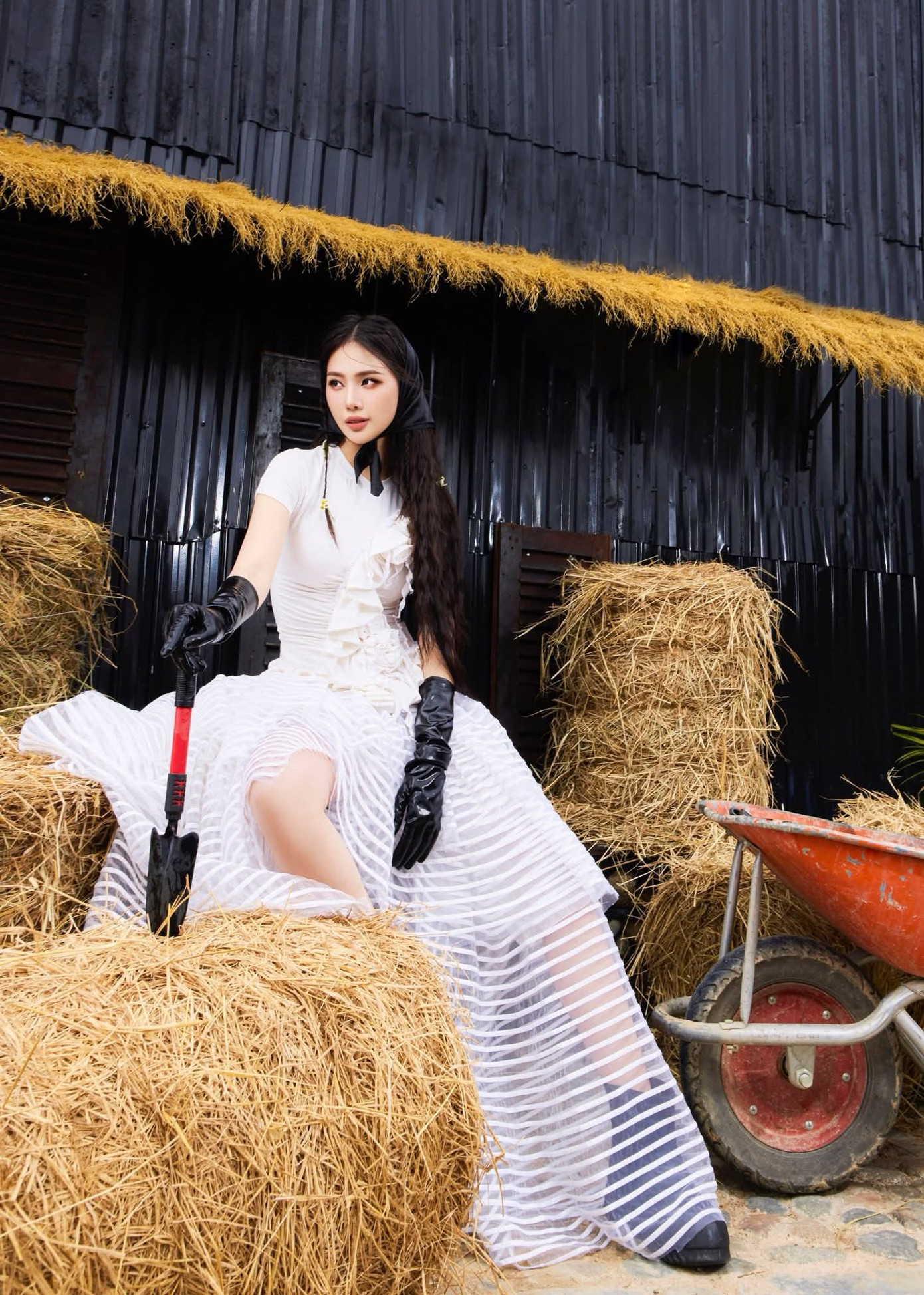 Phần vai dựng phom mang tính điêu khắc, đối lập với phần tầng voan bồng nhẹ ở chân váy, tạo chuyển động mềm mại nhưng đầy kịch tính cho nàng hậu khi di chuyển.