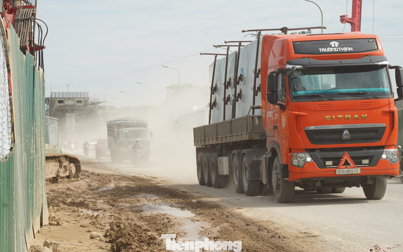 Nhiều đoạn đất bị vương vãi khắp mặt đường, chỉ cần một vệt bánh xe lăn qua là bụi bốc lên mù mịt.