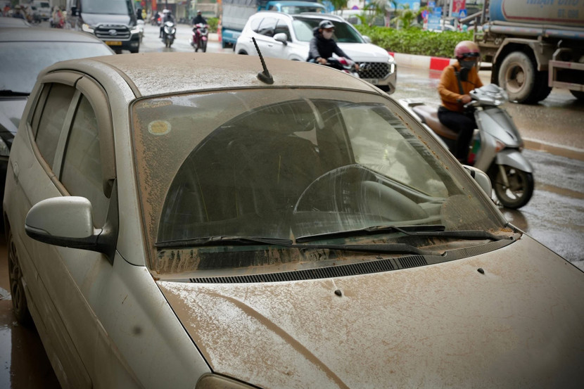Những chiếc xe ô tô đỗ bên đường bị bùn đất phủ kín