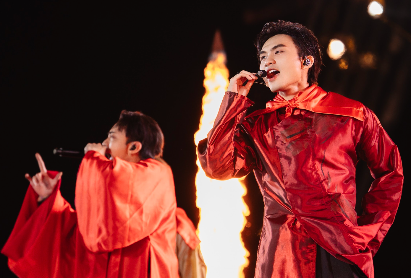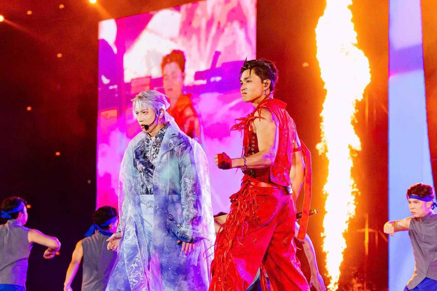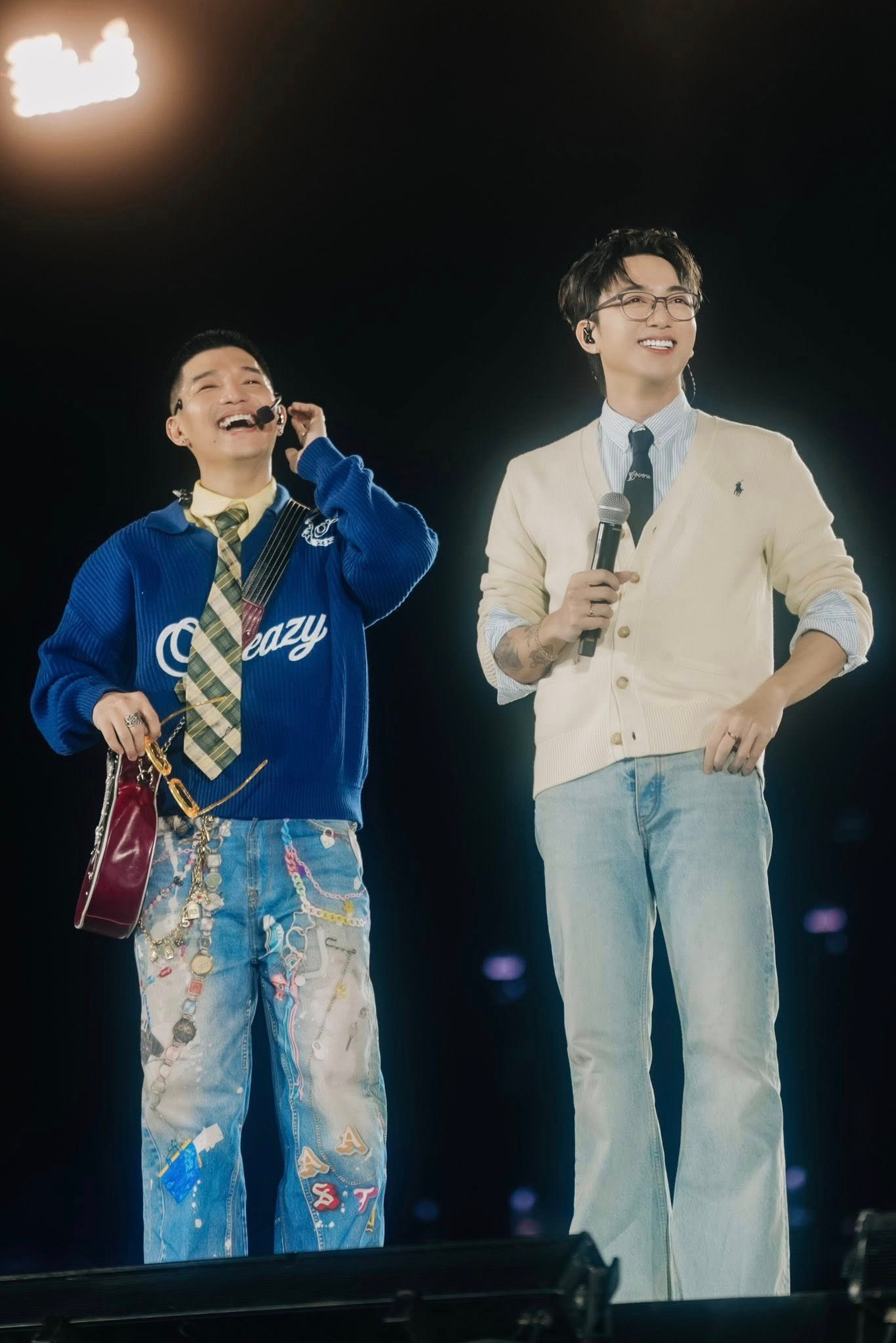 Jun Phạm (áo đỏ) và S.T Sơn Thạch trên sân khấu kết hợp.