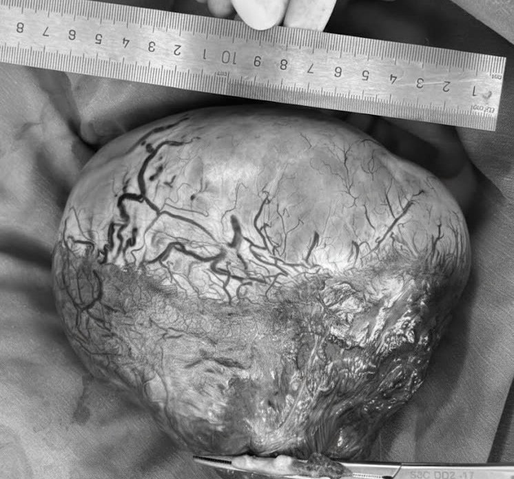 Khối u tinh hoàn lạc chỗ kích thước lớn được lấy ra từ ổ bụng. Ảnh: BVCC