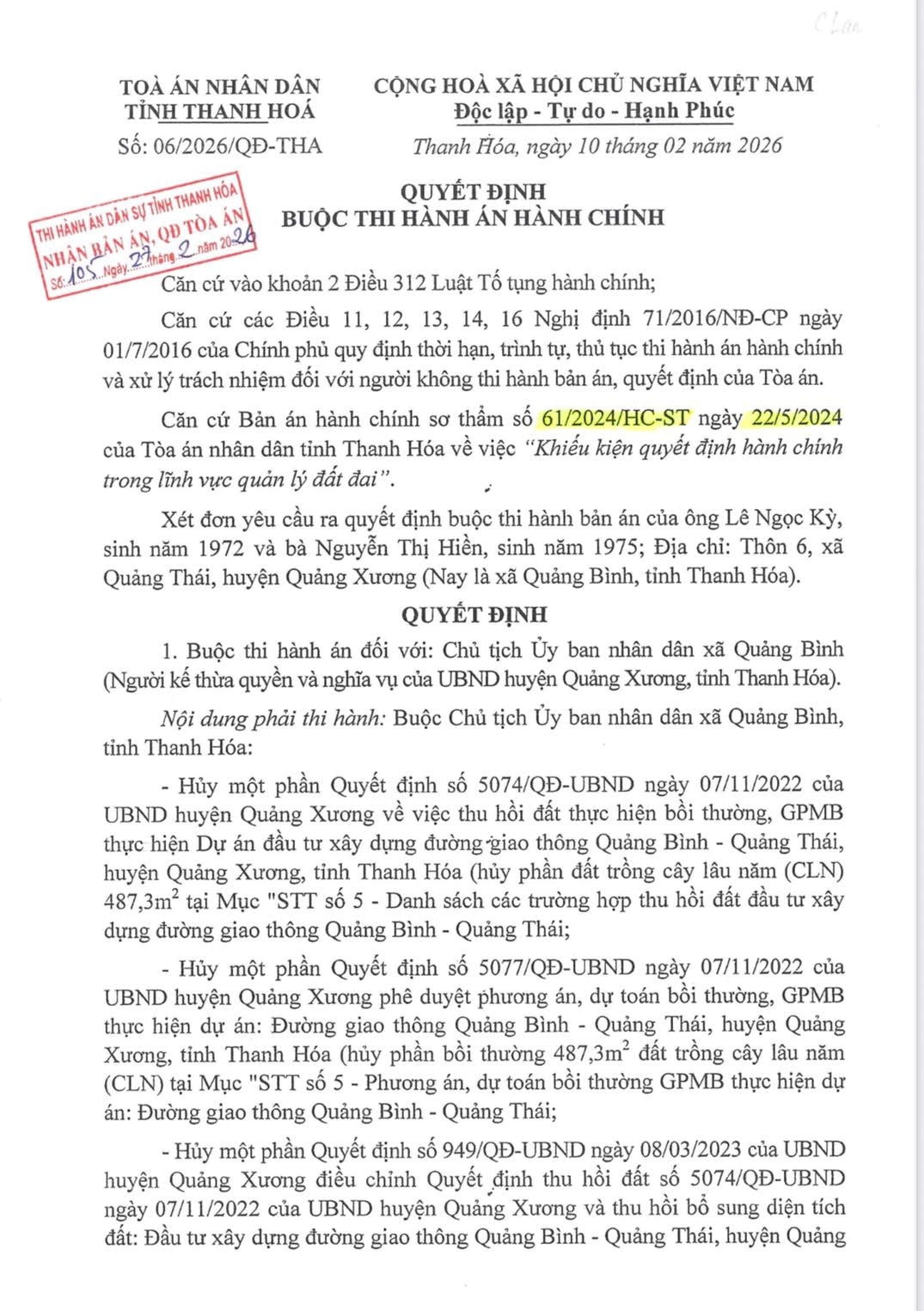 Ngày 10/2/2026, Phó Chánh án TAND tỉnh Thanh Hóa, Nguyễn Văn Khuyên ký quyết định buộc thi hành án đối với: Chủ tịch UBND xã Quảng Bình, tỉnh Thanh Hóa (người kế thừa quyền và nghĩa vụ của UBND huyện Quảng Xương, tỉnh Thanh Hóa).