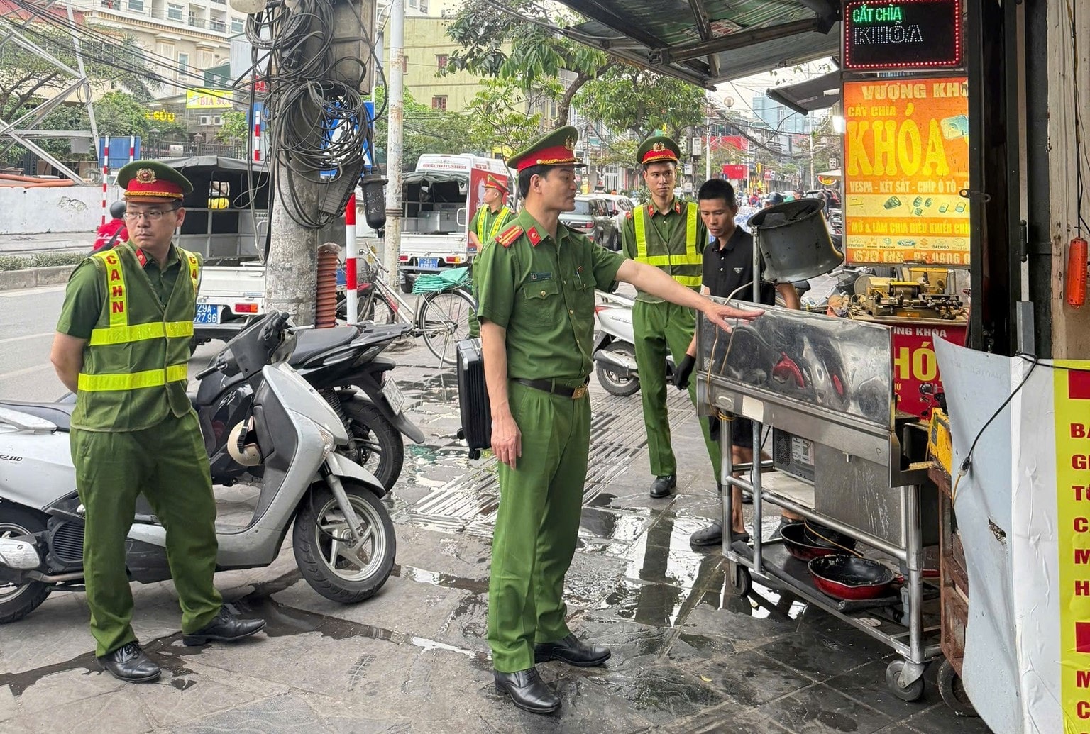 Công an phường Vĩnh Tuy nhắc nhở các hộ kinh doanh trên địa bàn phường. Ảnh: PV