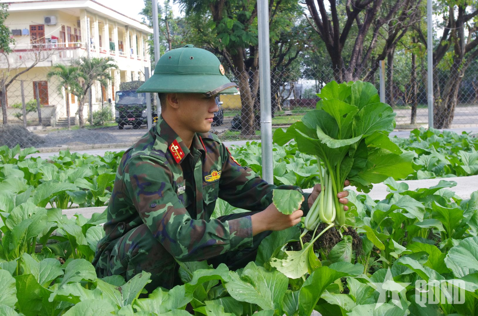 Chiến sĩ Tiểu đoàn Đặc công 409 thu hoạch rau xanh.