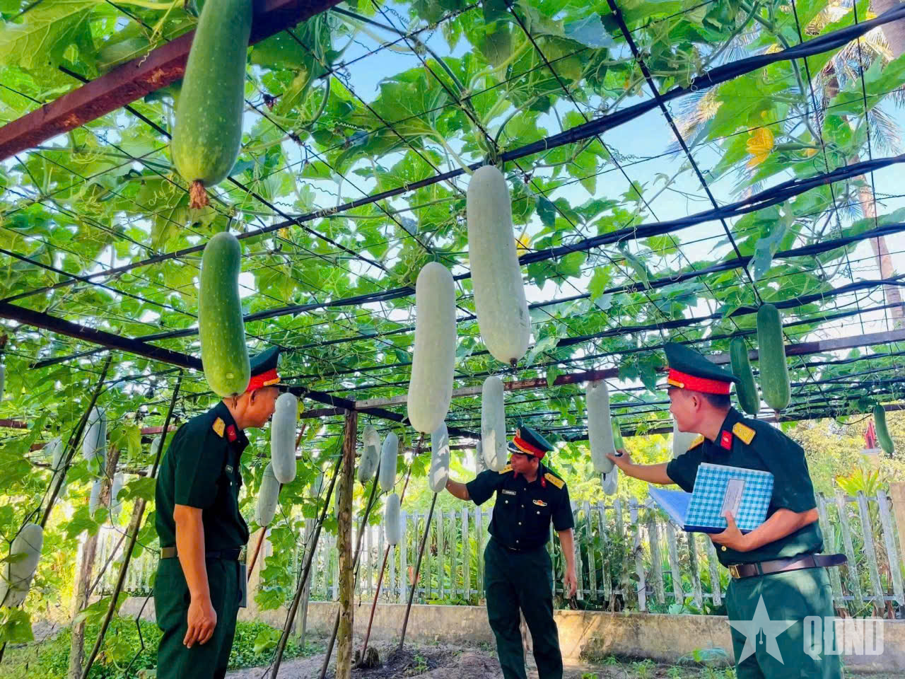 Giàn bí trĩu quả do bộ đội tự tay vun trồng, chăm sóc.