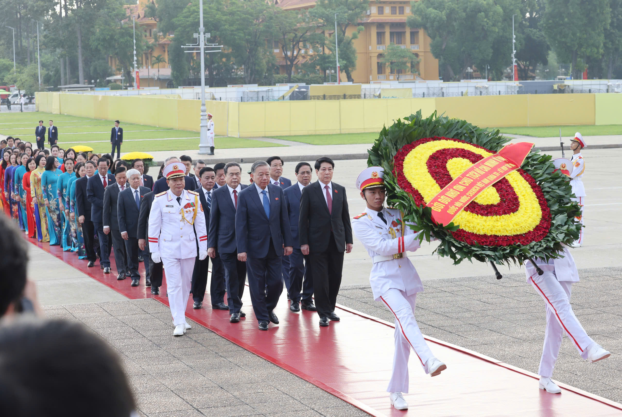 Lãnh đạo Đảng, Nhà nước cùng các đại biểu vào Lăng viếng Chủ tịch Hồ Chí Minh trước phiên khai mạc Kỳ họp thứ 10, Quốc hội khóa XV, sáng 20-10. Ảnh: QUANG PHÚC