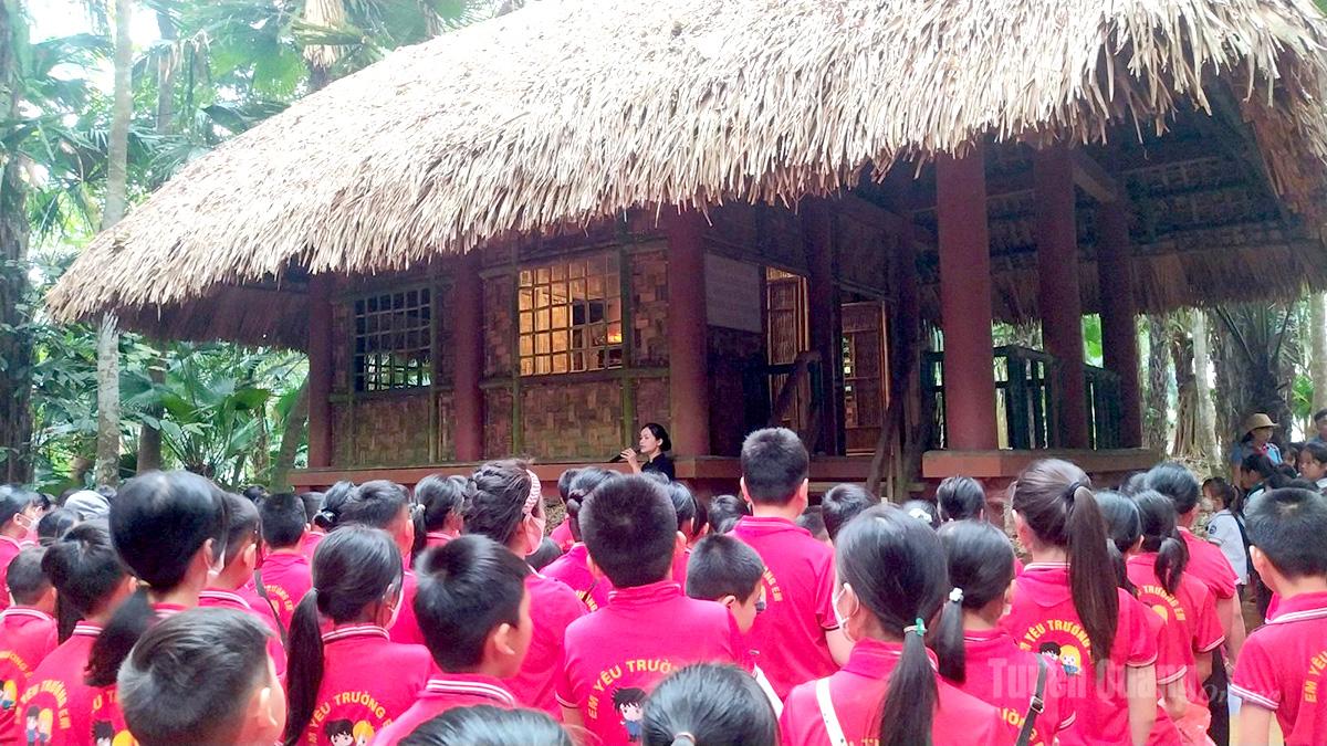 Các em học sinh tham quan, tìm hiểu di tích Lán ở và làm việc của Chủ tịch Hồ Chí Minh trong thời gian diễn ra Đại hội II của Đảng tại Khu di tích quốc gia đặc biệt Kim Bình.