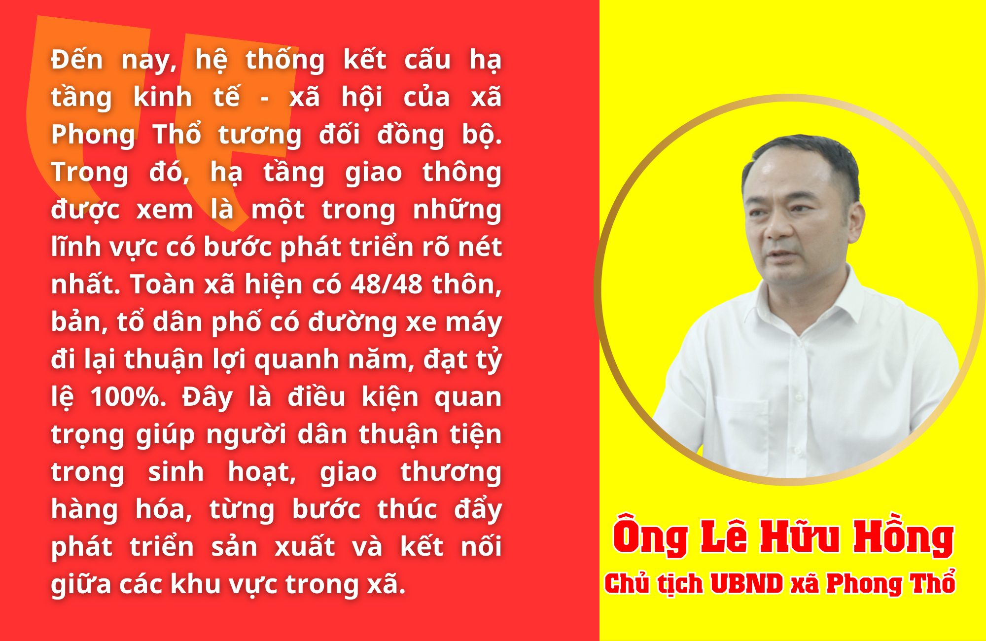 Những kết quả đạt được trong xây dựng kết cấu hạ tầng kinh tế - xã hội đã và đang tạo động lực quan trọng cho sự phát triển toàn diện của xã Phong Thổ. Đây là cơ sở vững chắc để xã tiếp tục huy động và sử dụng hiệu quả các nguồn lực, từng bước hoàn thiện hạ tầng theo hướng đồng bộ, hiện đại.