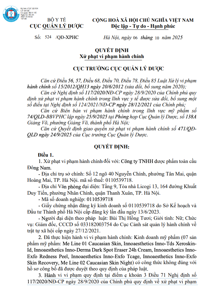 Hình ảnh Quyết định số 524/QĐ-XPHC về việc xử phạt vi phạm hành chính Công ty TNHH dược phẩm toàn cầu Đông Nam do Cục Quản lý Dược ban hành.