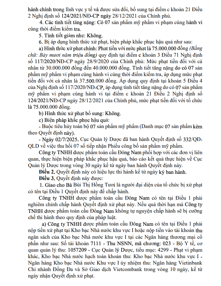 Với lỗi vi phạm này, Công ty TNHH Dược phẩm Toàn cầu Đông Nam bị xử phạt 75 triệu đồng, đồng thời buộc tiêu hủy toàn bộ 7 sản phẩm mỹ phẩm trên.