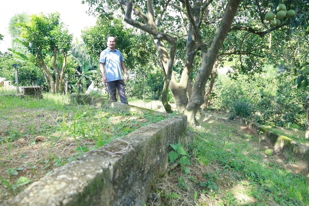 Sau lời chia sẻ, ông Định dẫn chúng tôi đi thăm khu vườn bưởi rộng 1 ha của gia đình, nơi hiện có khoảng 350 gốc bưởi, trong đó nhiều cây đã có tuổi đời từ 50 đến 60 năm, còn lứa bưởi trồng sau cũng đã 45 năm. Giữa vườn, có vài gốc bị vàng lá, vàng quả do đợt ngập úng kéo dài trong mùa mưa năm trước. Nhìn những gốc bưởi bị ảnh hưởng mới thấm thía hết được những vất vả, rủi ro mà nông dân phải đối mặt mỗi khi thời tiết không thuận lợi.