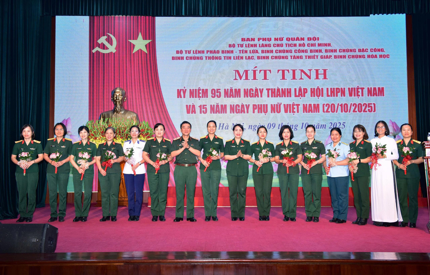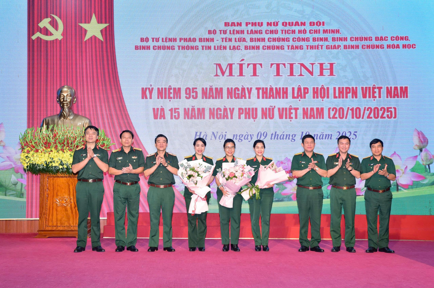 Lãnh đạo các cơ quan, đơn vị tặng hoa chúc mừng những nữ quân nhân đang công tác trong Quân đội.