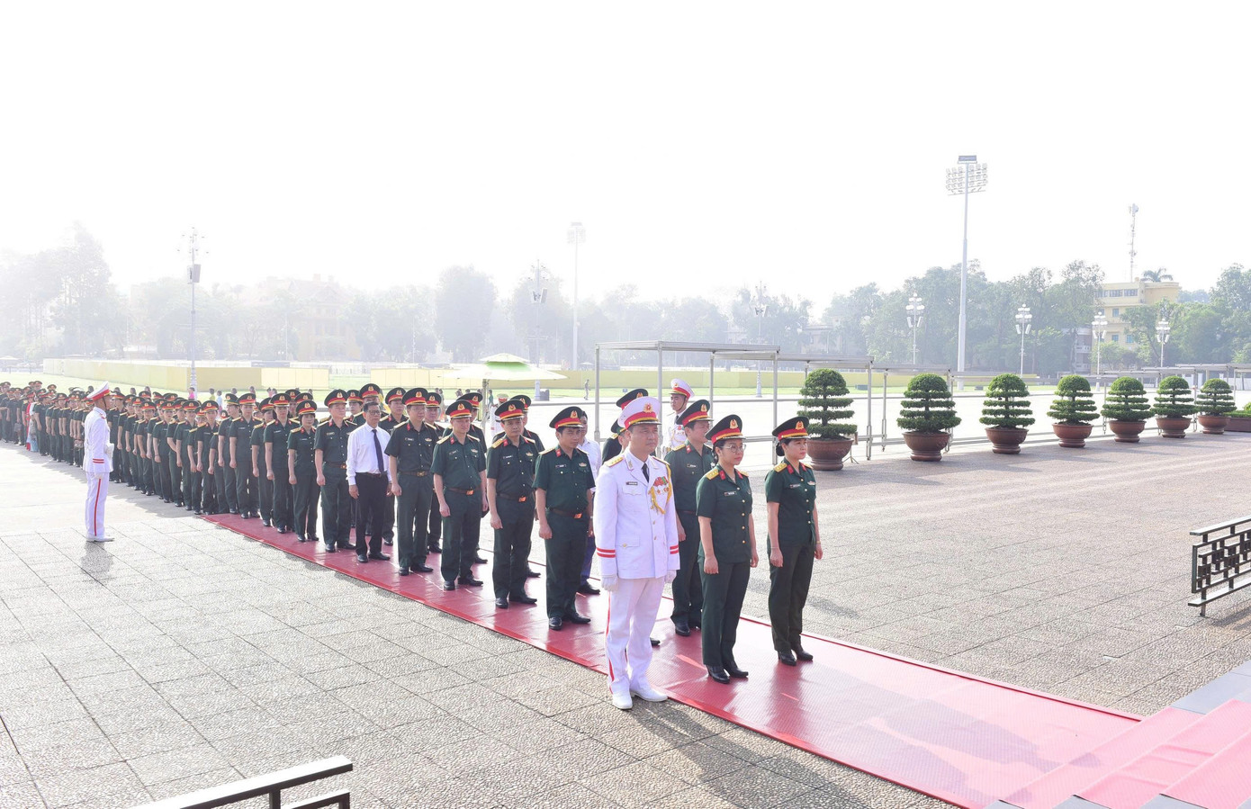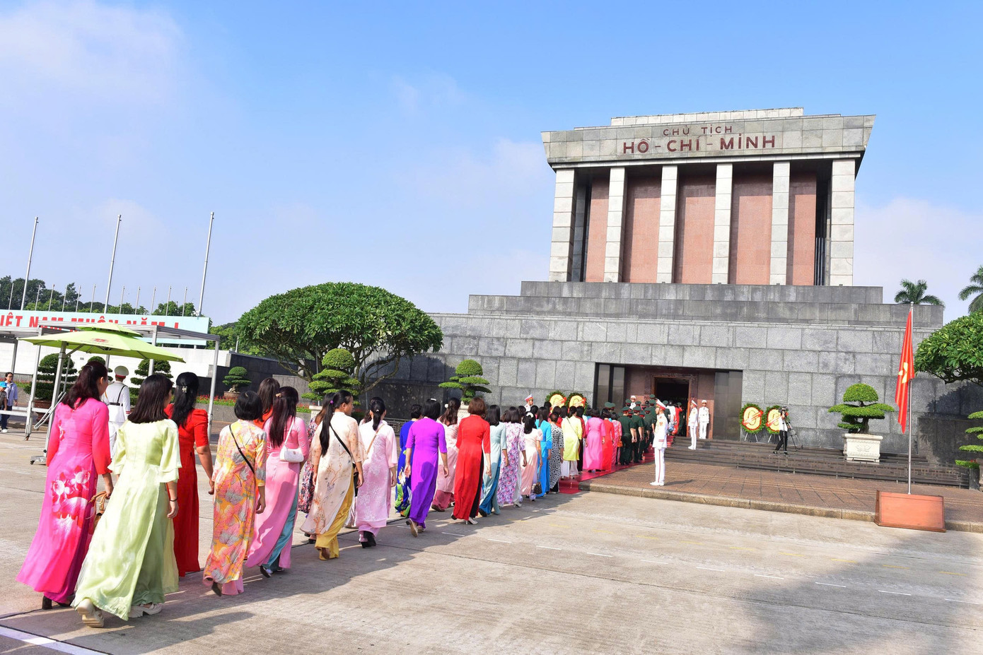 Trước buổi mít tinh, đoàn đại biểu phụ nữ Quân đội và các đại biểu đã đến dâng hoa, vào Lăng viếng Chủ tịch Hồ Chí Minh.