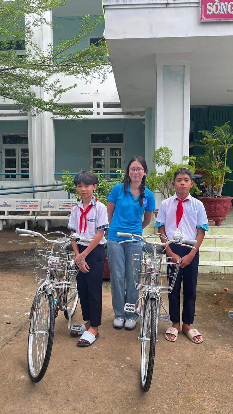 Bảo Nguyên trong một lần tham gia thiện nguyện cùng mẹ, trao xe đạp cho học sinh vượt khó. Ảnh: NVCC