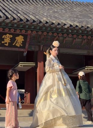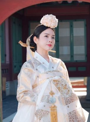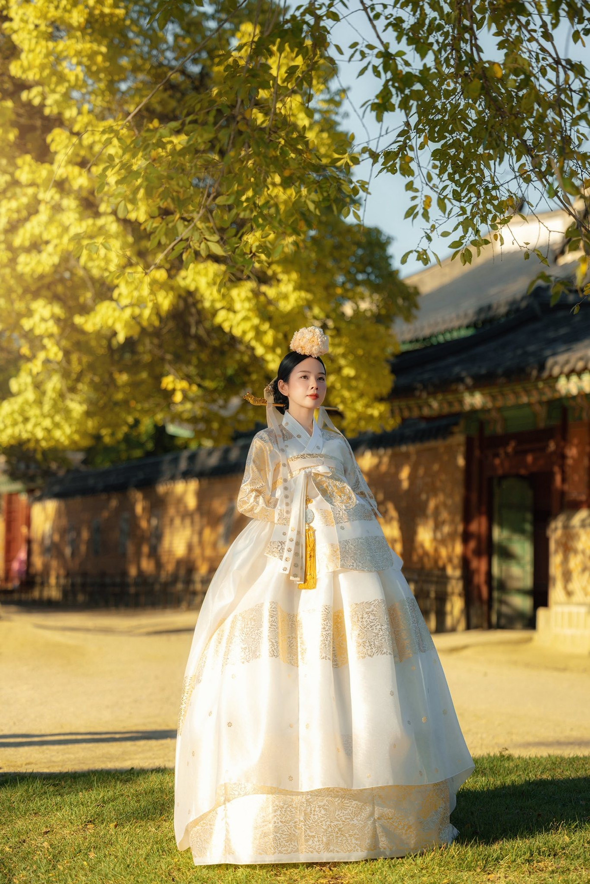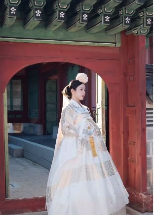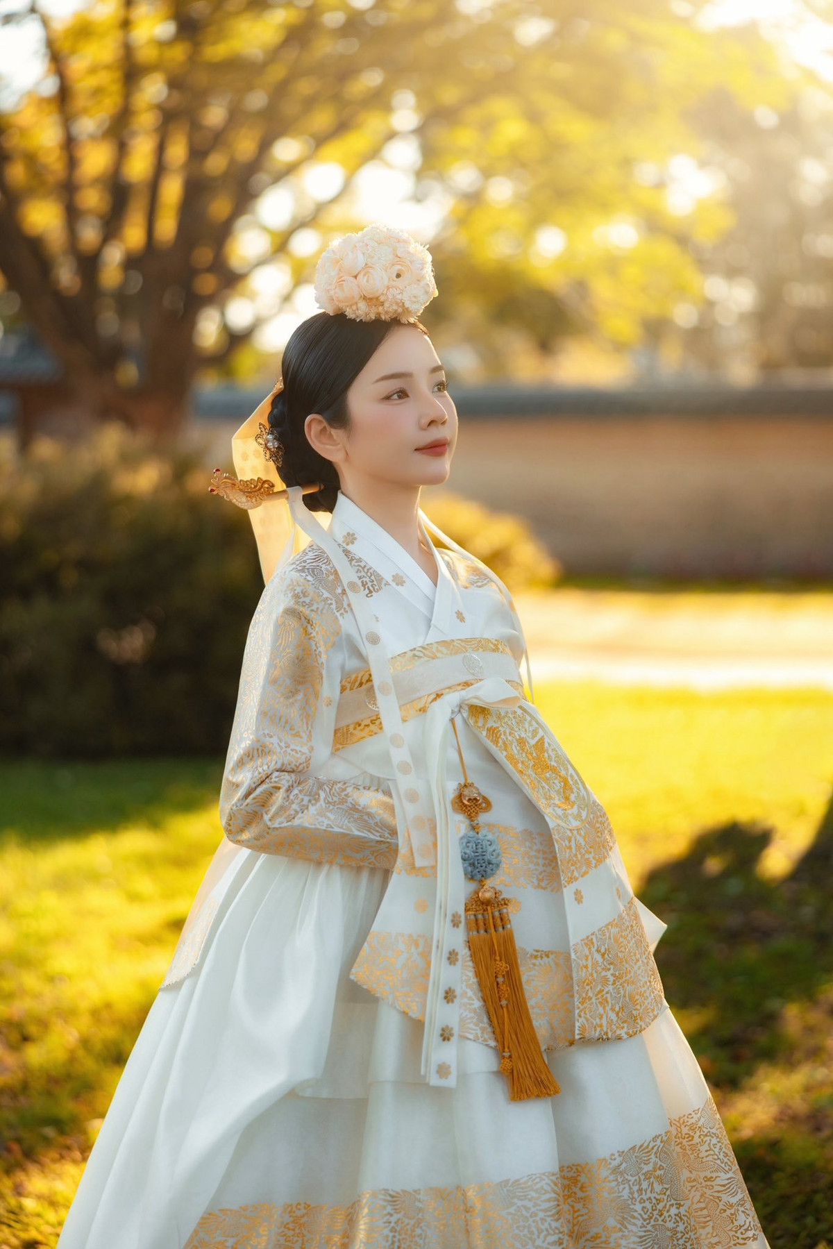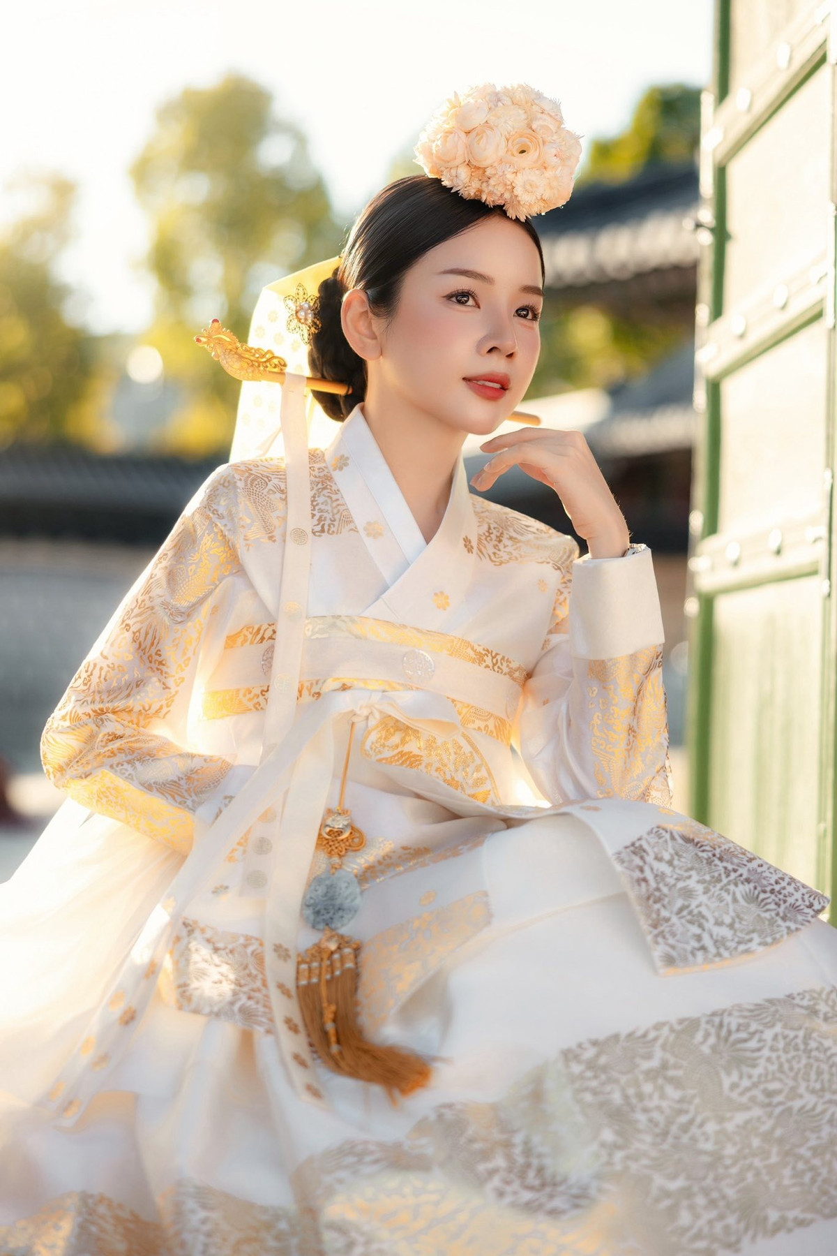 Phần áo khoác ngoài (jeogori) và chân váy phồng rộng (chima) đều được trang trí tinh xảo, làm nổi bật phong cách Hanbok Hoàng gia truyền thống. (Ảnh: FBNV)